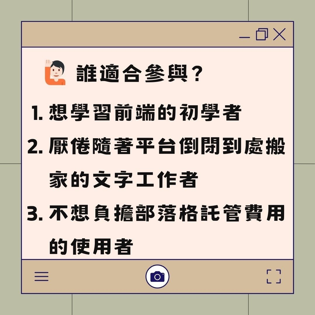 誰適合參與這次的活動呢?首先,如果您是想學習前端技術的初學者,這場講座將為您提供一個理想的學習起點。其次,如果您想脫離隨著平台倒閉而到處搬家的麻煩,我們將教您如何建立完全自主的部落格。最後,如果您不想負擔部落格託管費用,這場講座將為您展示如何在零成本下運行您的部落格。