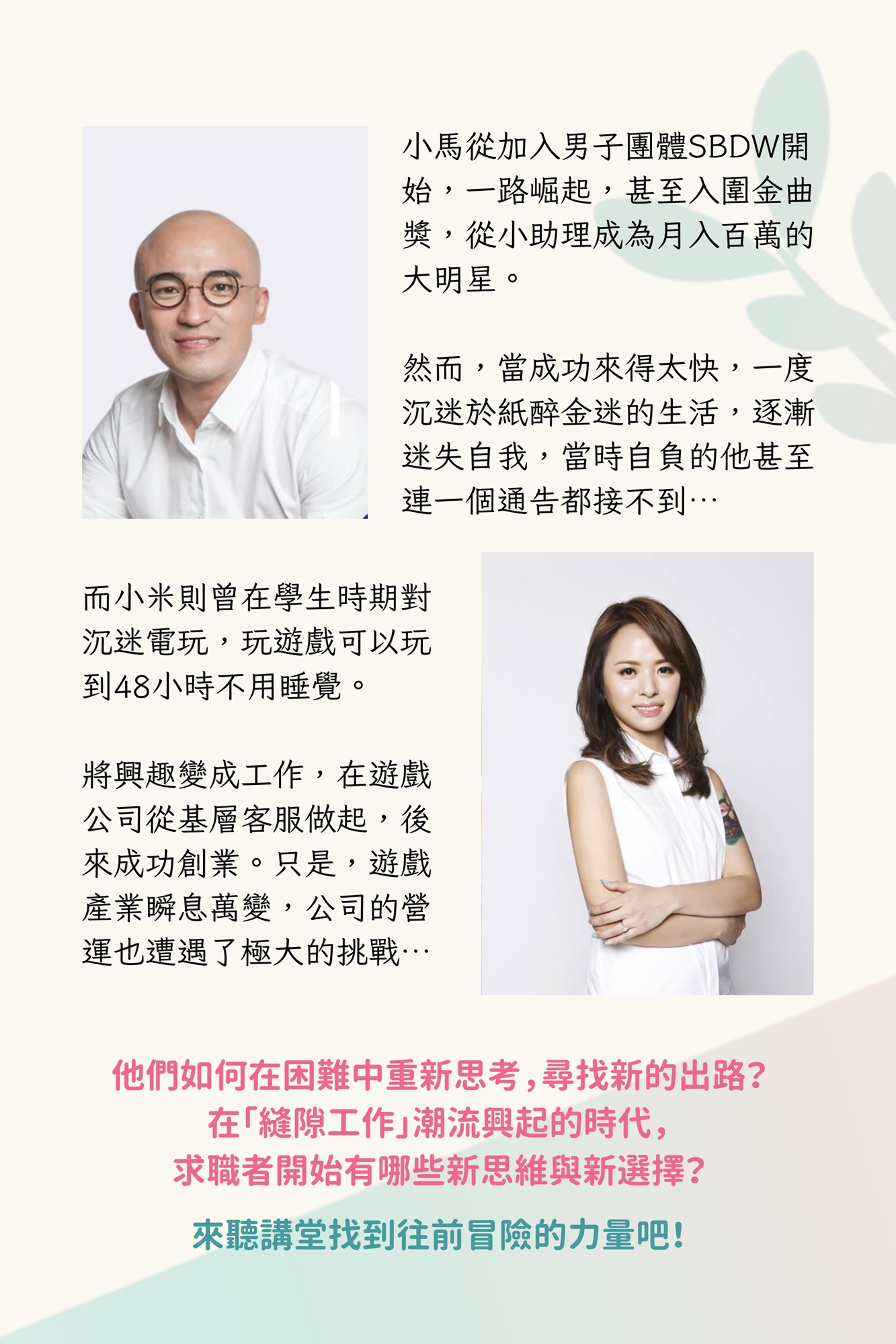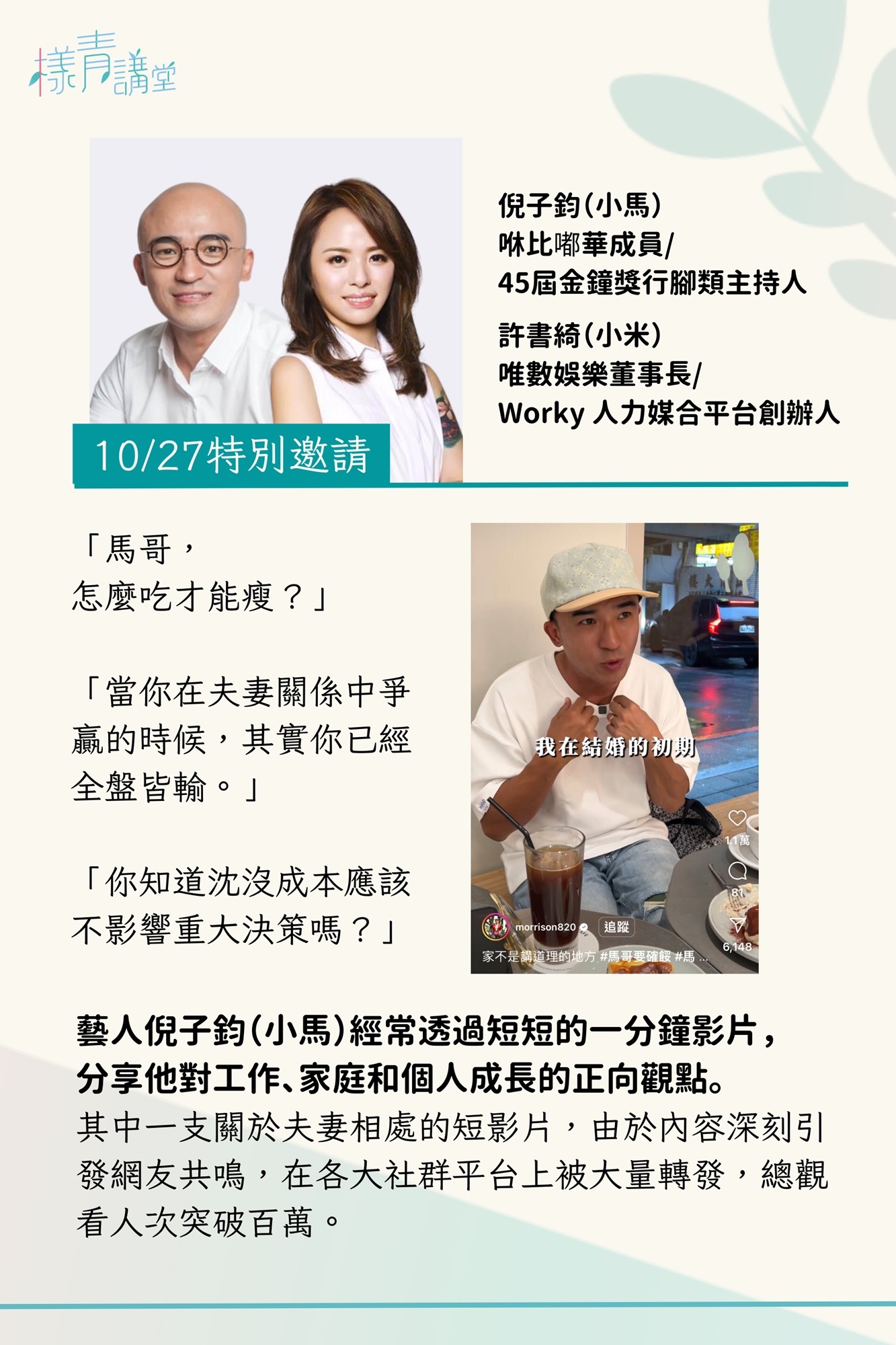 【 票券類別】講堂現場票 : 免費,可參加線上金句抽獎。中獎者除了可獲得台北樣推薦好書一本,會再額外獲得星巴克咖啡券一張。講堂線上票 : 免費,可參加線上金句抽獎,中獎者可獲得台北樣推薦好書一本。 — 讓你成為更好的你 — 精選活動回顧 超過 10 位專業講師精選影片回顧(點圖片即可觀看影片)