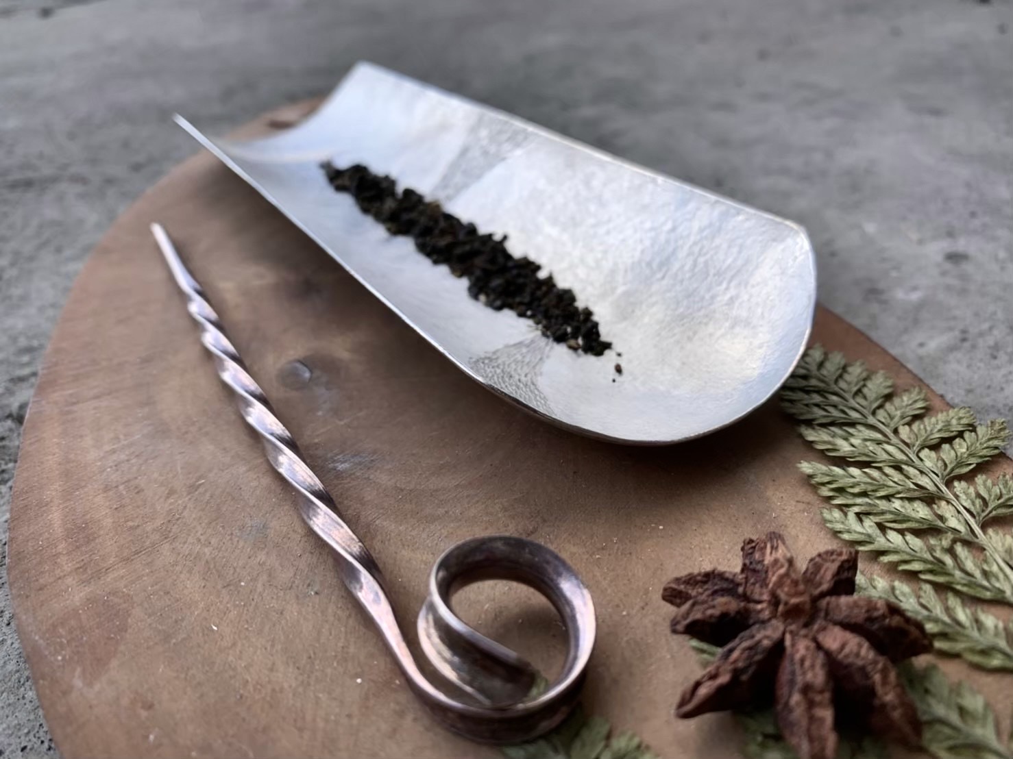 ∷請注意:本次課程為茶針創作,圖中茶則為攝影參考示意,不列入本次課程內容。圖片提供:金工木印工作室
