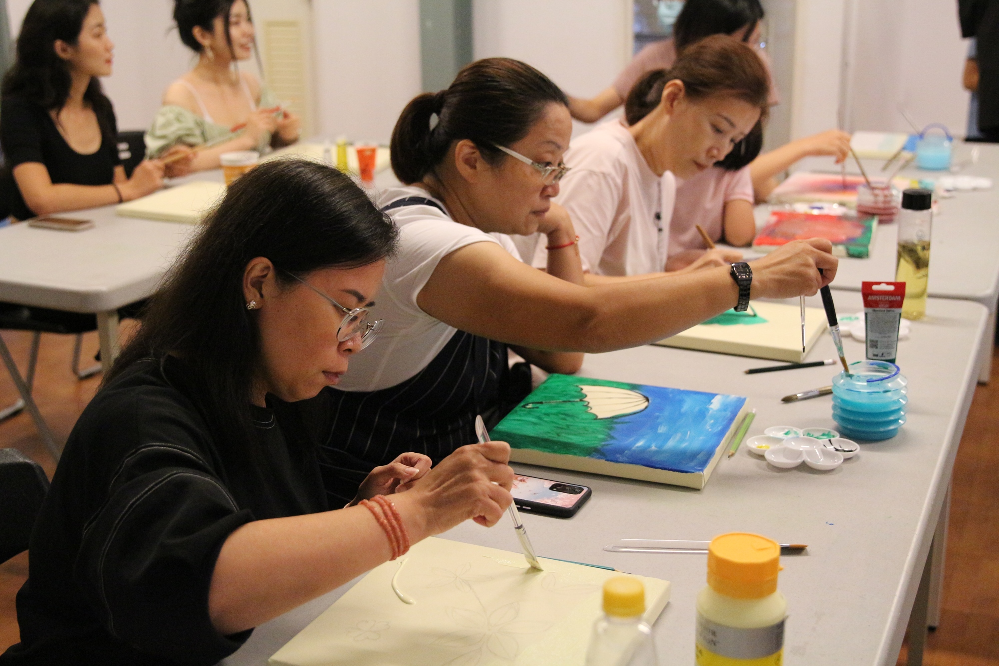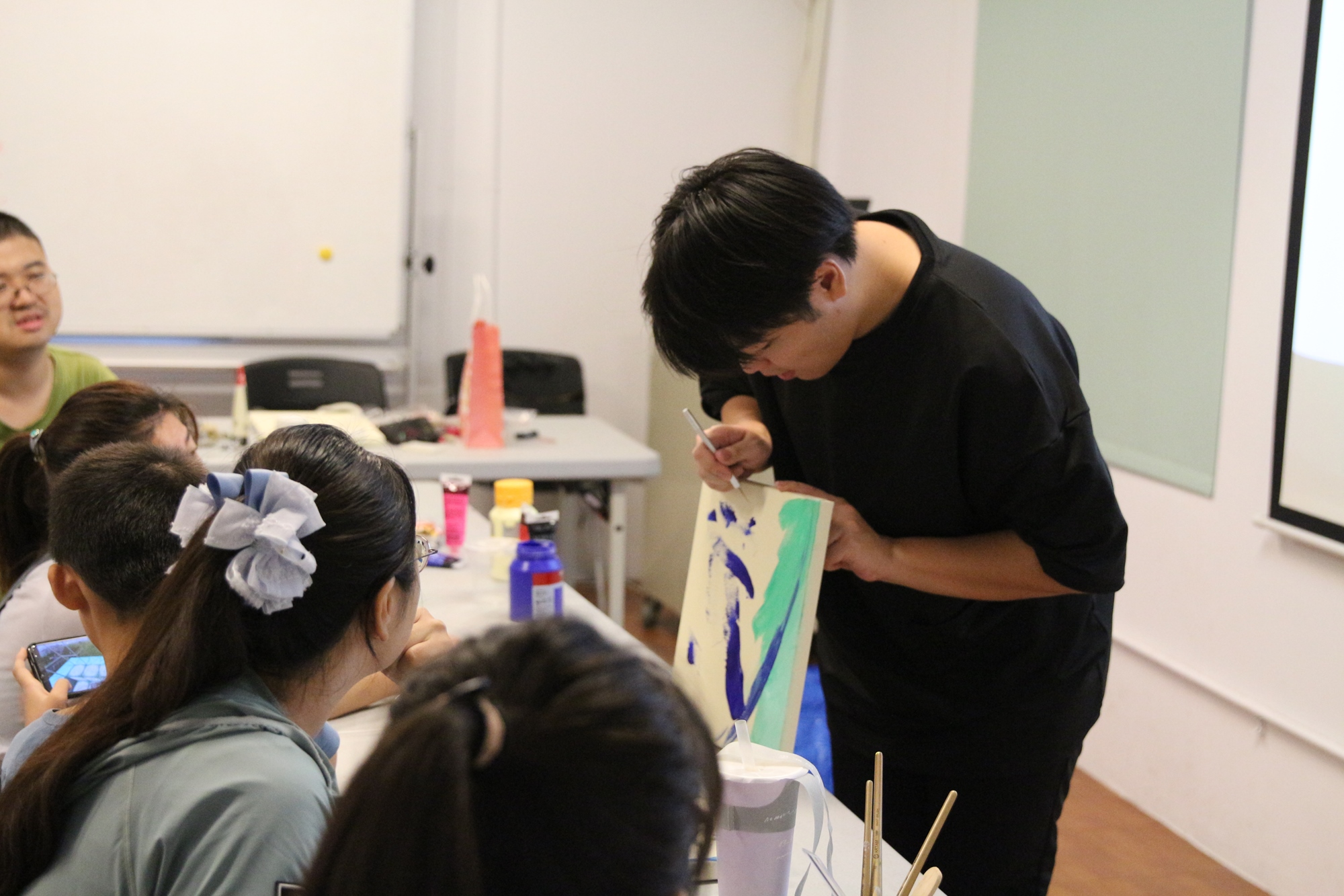 學員運用壓克力顏料繪製喜歡的畫面,再運用電子材料製作成複合媒材畫作