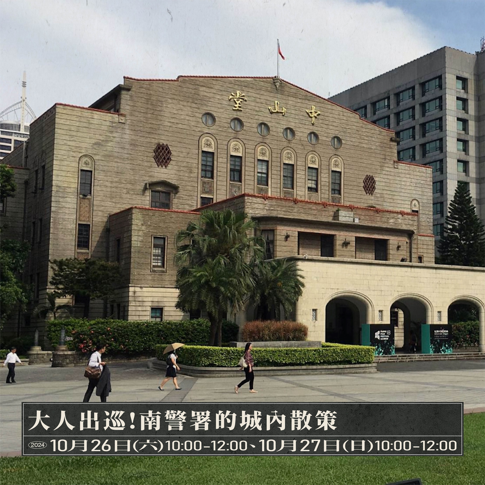 位於中山堂北側的「臺北市政府警察局」,原為日本時代臺北南警察署的所在地。本場次將以南署為核心,規劃走訪當時重要的南署管轄範圍和警務機構,包含派出所舊址以及周邊重要的文化資產,如中山堂、菊元百貨、國立臺灣博物館、臺灣銀行、西門紅樓等。1920年代初期,臺灣民族主義抬頭,地方社會運動興起,因而被「警察大人」盯上,派出所構成了日治警察體系的監視區,作為巡邏以及管理民眾的最小單位,南署警權勢力與人民的日常生活高度相關。透過實地走訪,聆聽過往的故事,讓我們跟著大人的腳步,漫步在南署轄區,從中看見社會脈動的歷史痕跡。