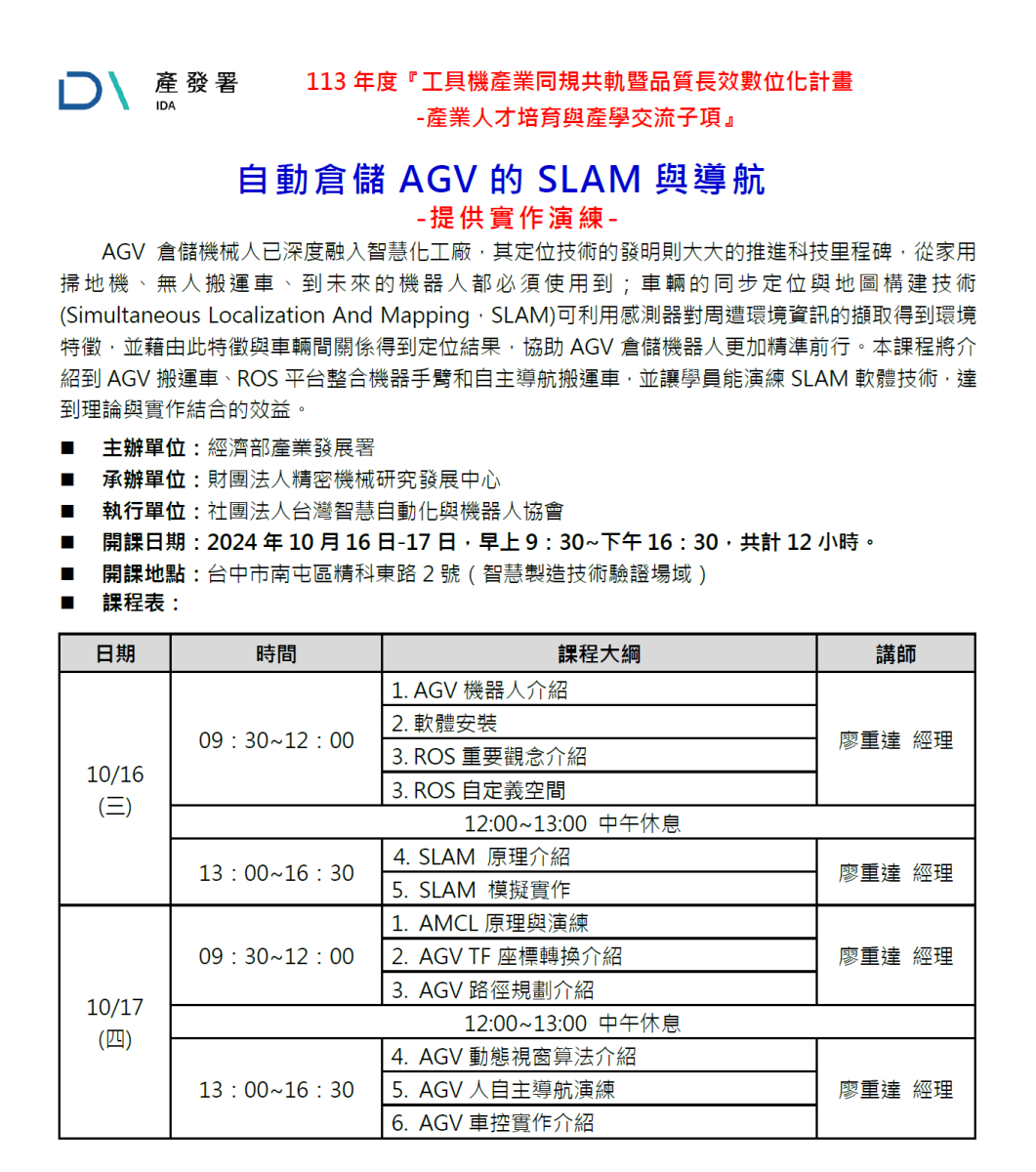 AGV倉儲機械人已深度融入智慧化工廠,其定位技術的發明則大大的推進科技里程碑,從家用掃地機、無人搬運車、到未來的機器人都必須使用到;車輛的同步定位與地圖構建技術 (Simultaneous Localization And Mapping,SLAM)可利用感測器對周遭環境資訊的擷取得到環境特徵,並藉由此特徵與車輛間關係得到定位結果,協助AGV倉儲機器人更加精準前行。本課程將介紹到AGV搬運車、ROS平台整合機器手臂和自主導航搬運車,並讓學員能演練SLAM軟體技術,達到理論與實作結合的效益。