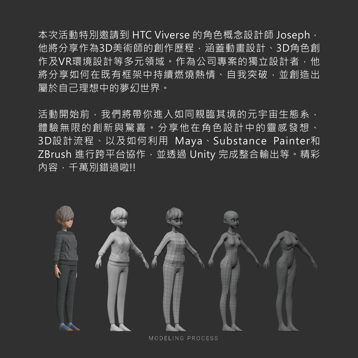 本次活動特別邀請到 HTC Viverse 元宇宙的設計師 Joseph ,他將分享作為 3D 美術師的創作歷程,涵蓋動畫設計、3D 角色創作及 VR 環境設計等多元領域🌟。作為公司專案的獨立設計者,他將分享如何在既有框架中持續燃燒熱情、自我突破,並創造出屬於自己理想中的夢幻世界。