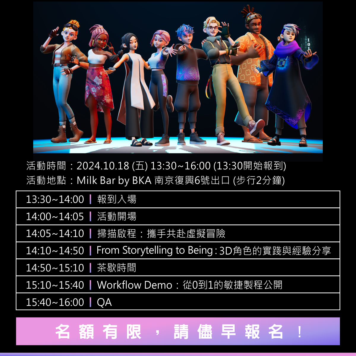 活動開始前,我們將帶你進入如同親臨其境的元宇宙(Metaverse)生態系🪐,體驗無限的創新與驚喜。分享他在角色設計中的靈感發想、3D 設計流程、以及如何利用 Maya、Substance Painter和 ZBrush 進行跨平台協作,並透過 Unity 完成整合輸出等。精彩內容,千萬別錯過啦!!