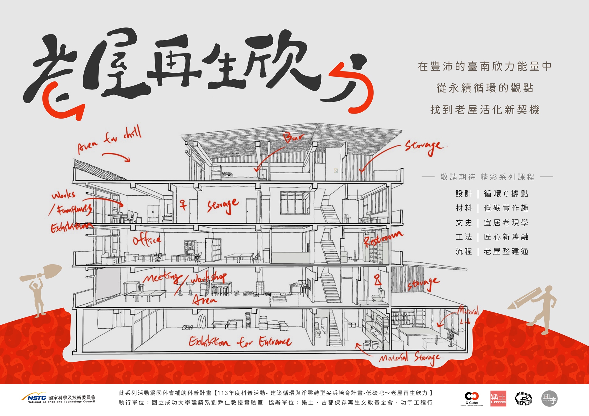 在豐沛的台南老屋欣力能量中,從永續循環的觀點,找到老屋活化新契機。從材料出發,聚焦「C-Slurry循環漿體」應用在老屋翻修中,結合可逆式設計、低碳工法與循環材料,提升建築永續性。透過實作工作坊、講座、論壇、共創成果展等過程,展示創新材料如何賦予老建築新生命。