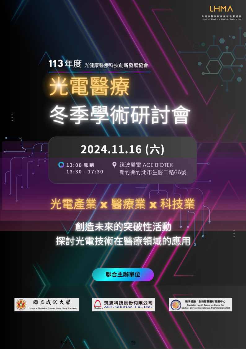 繼今年中與奈米生醫學會聯合舉辦百人研討會大獲成功後,光健康醫療科技創新發展協會(以下簡稱本會)將於本年度隆重推出「113年度 光電醫療 冬季學術研討會」。本次研討會特別邀請來自醫界、學界及產業界的五位頂尖專家,共同探討光電科技與醫療之結合,並在不同領域的創新應用,亦藉此推動醫療技術與產業的進一步發展。研討會後更安排晚宴,為與會者提供深度交流與合作的機會。