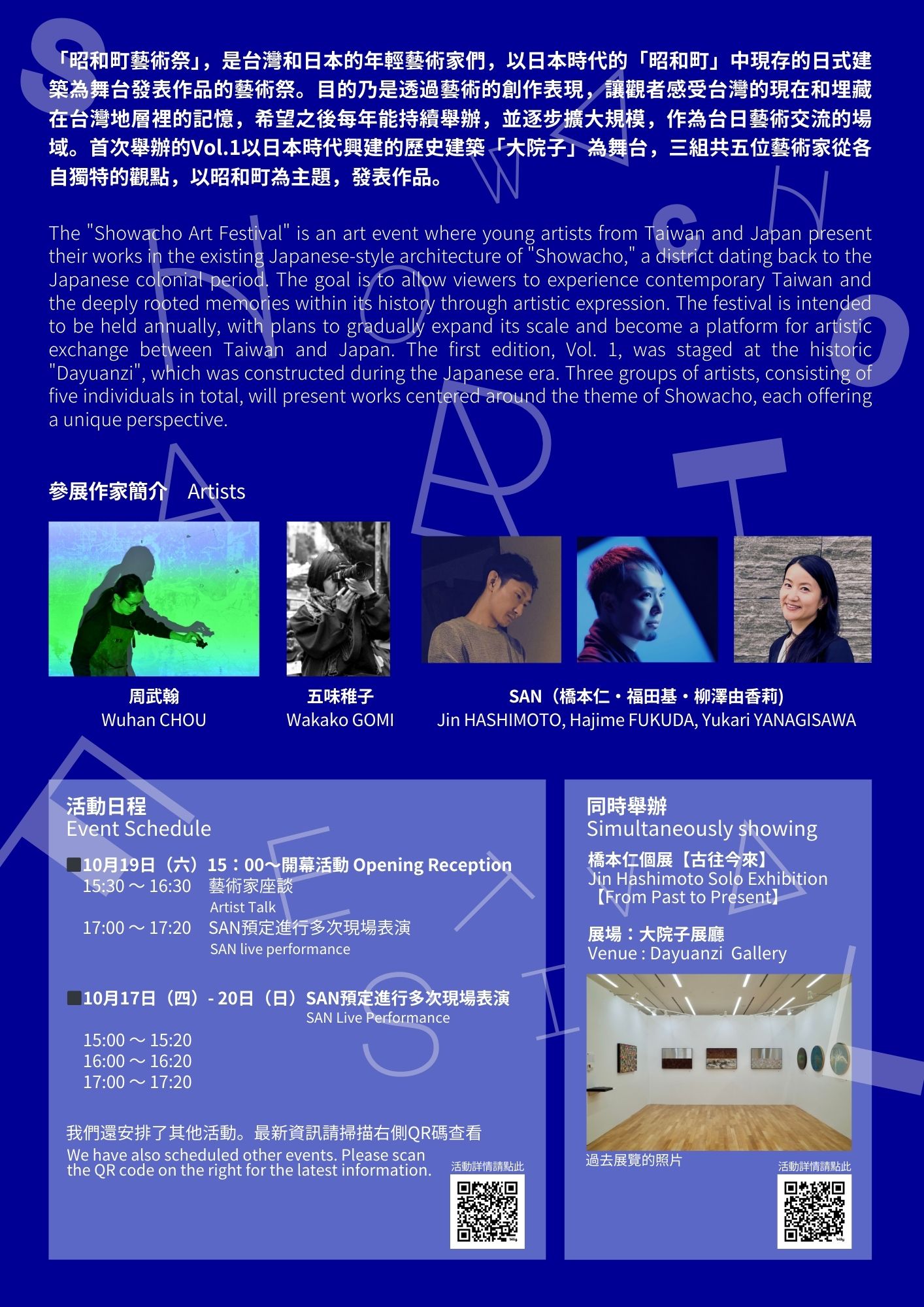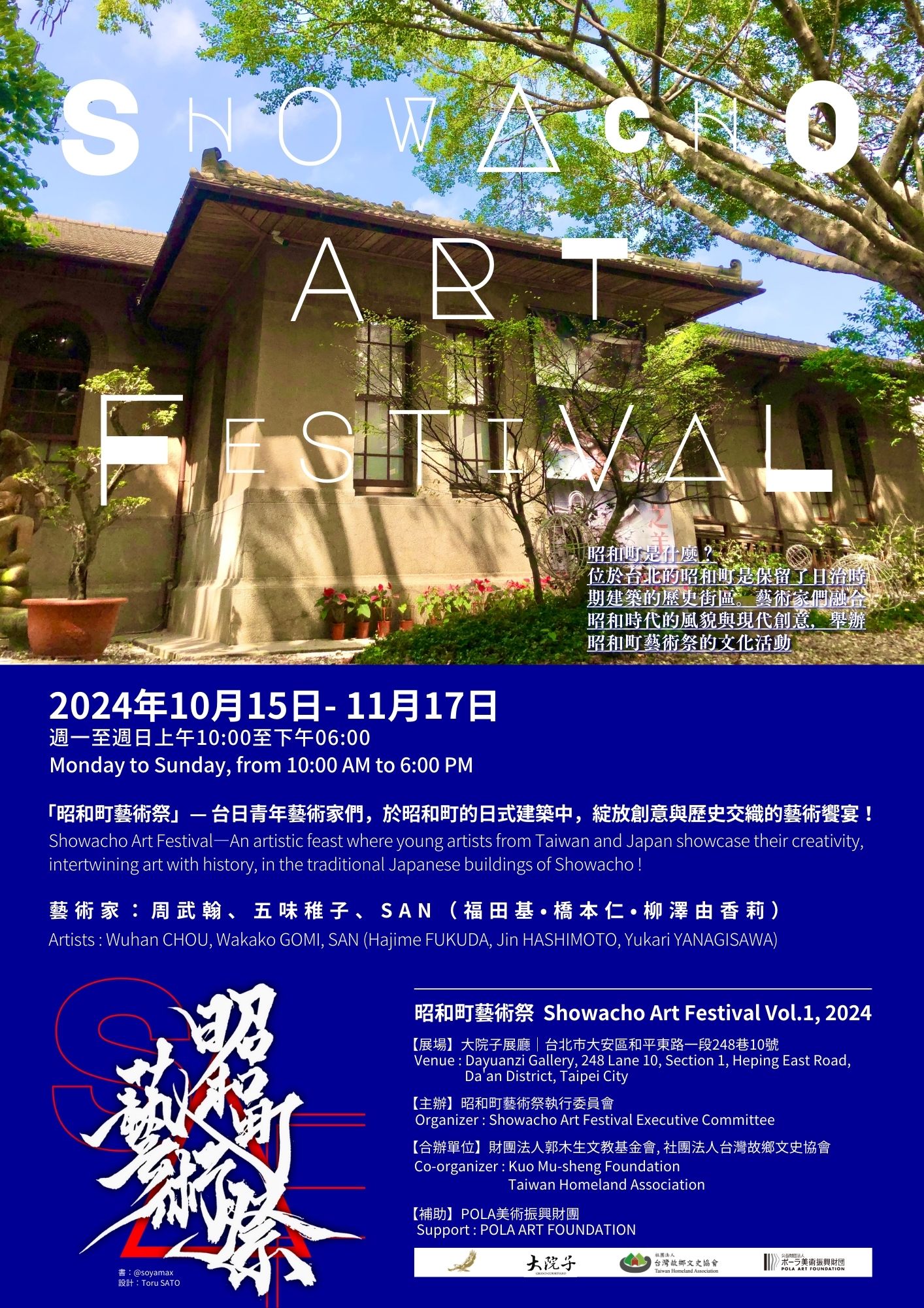 「昭和町藝術祭」,是台灣和日本的年輕藝術家們,以日本時代的「昭和町」中現存的日式建築為舞台發表作品的藝術祭。目的乃是透過藝術的創作表現,讓觀者感受臺灣的現在和埋藏在臺灣地層裡的記憶,希望之後每年能持續舉辦,並逐步擴大規模,作為臺日藝術交流的場域。首次舉辦的Vol.1以日本時代興建的歷史建築「大院子」為舞台,三組共五位藝術家從各自獨特的觀點,以昭和町為主題,發表作品。