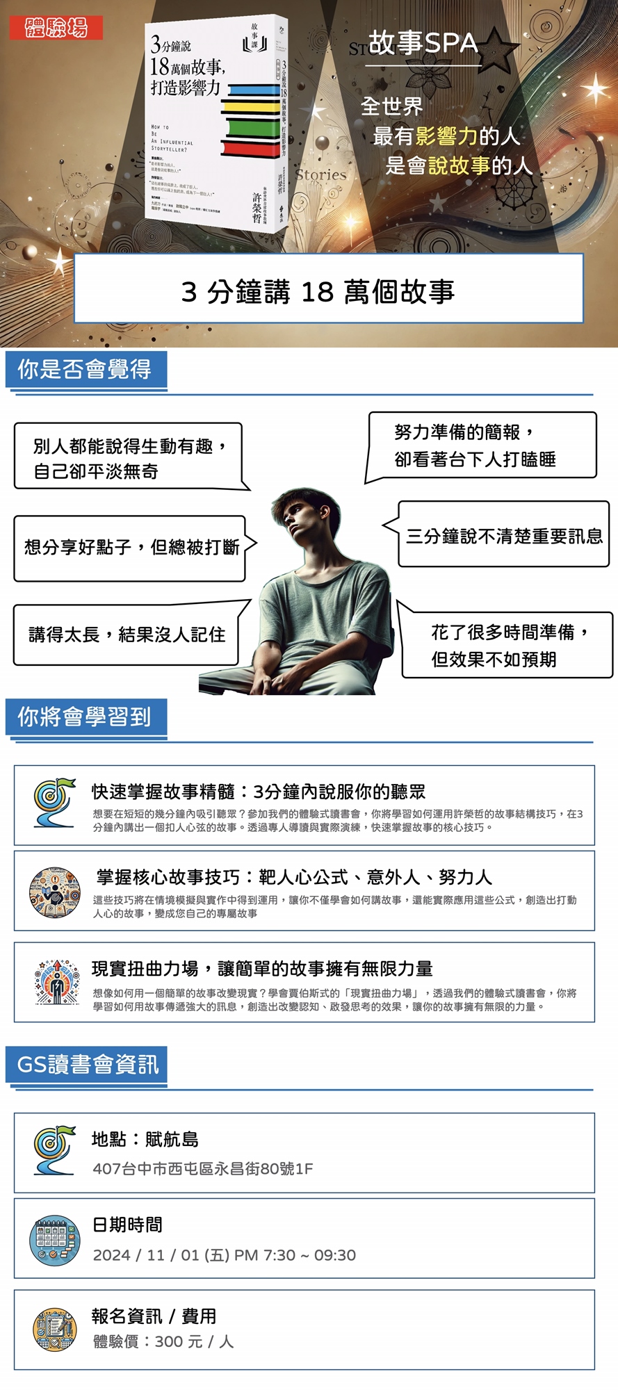 在這場體驗式讀書會中,我們將深入學習許榮哲的《3分鐘講18萬個故事》,幫助你掌握如何在短時間內講出有力且吸引人的故事。透過專人導讀、情境模擬、實作練習,你將學會如何運用「靶人心公式」、「意外人」與「努力人」等關鍵故事技巧,創造出感動聽眾的故事內容。無論你是希望提升簡報能力、改善溝通效果,或是在日常生活中更加自信地表達自己,這場讀書會將帶給你具體的應用工具,讓你不再為表達困擾。活動將結合「現實扭曲力場」,學習如何在短時間內改變他人的觀點,讓故事真正成為你傳遞訊息的強大武器。