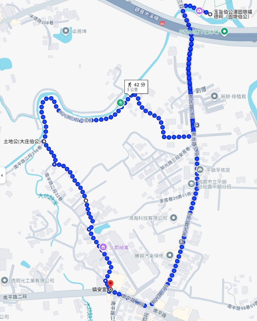 平鎮鎮安宮(起點)➲右轉南平路二段32巷➲右轉南平二路32巷108弄➲大庄伯公➲右轉平鎮大坑缺溪健行步道➲捷雅工程有限公司(新光路三段158巷路段)➲左轉新光路三段 ➲圓墩伯公➲新光路三段➲右轉南平路二段➲平鎮鎮安宮(終點)。