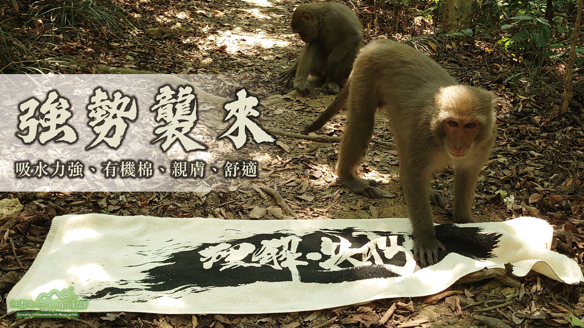 「理解共存」 運動毛巾,社團法人台灣獼猴共存協會 一直以來的目標與理念就是「理解,共存」,我們在做的事情是促進人們對於台灣獼猴的「理解」,經由理解尋找方法一起在台灣這塊土地「共存」下去。