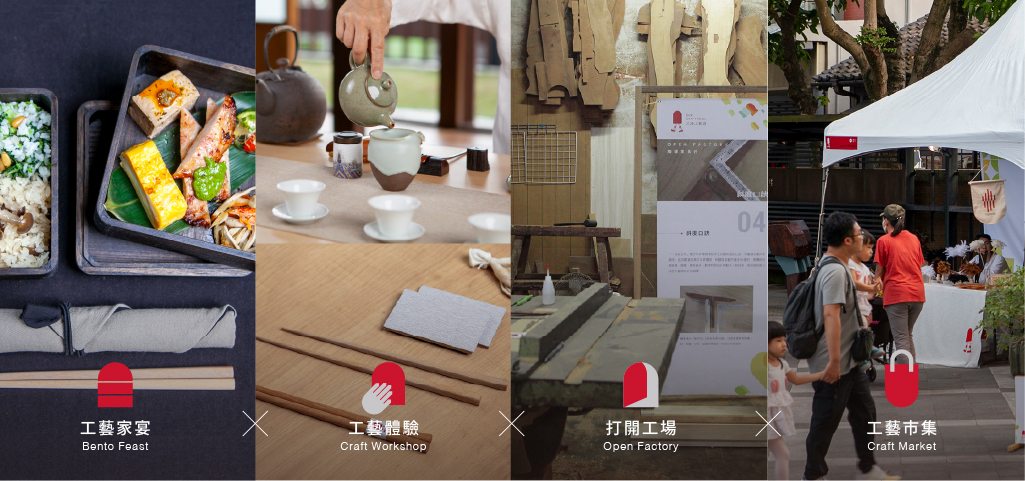10:30 木筷體驗 → 11:00工藝便當宴 → 12:00 茶席體驗 → 12:30打開工場 → 14:30 工藝市集