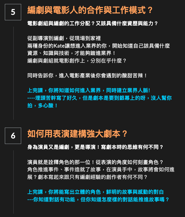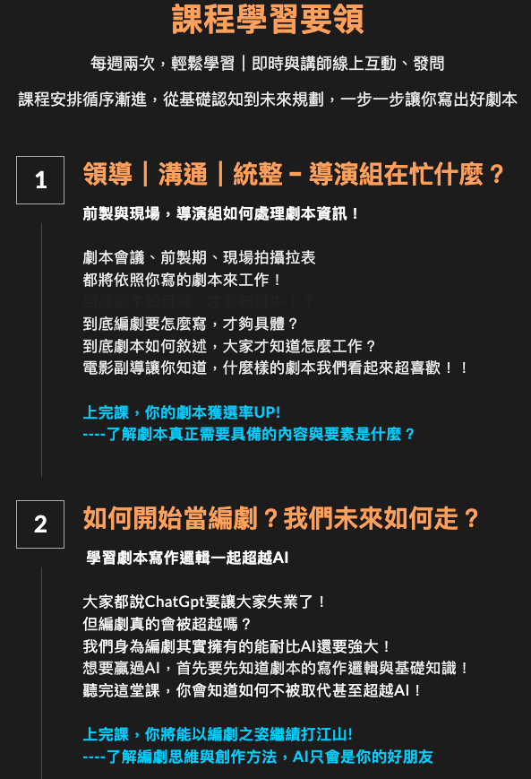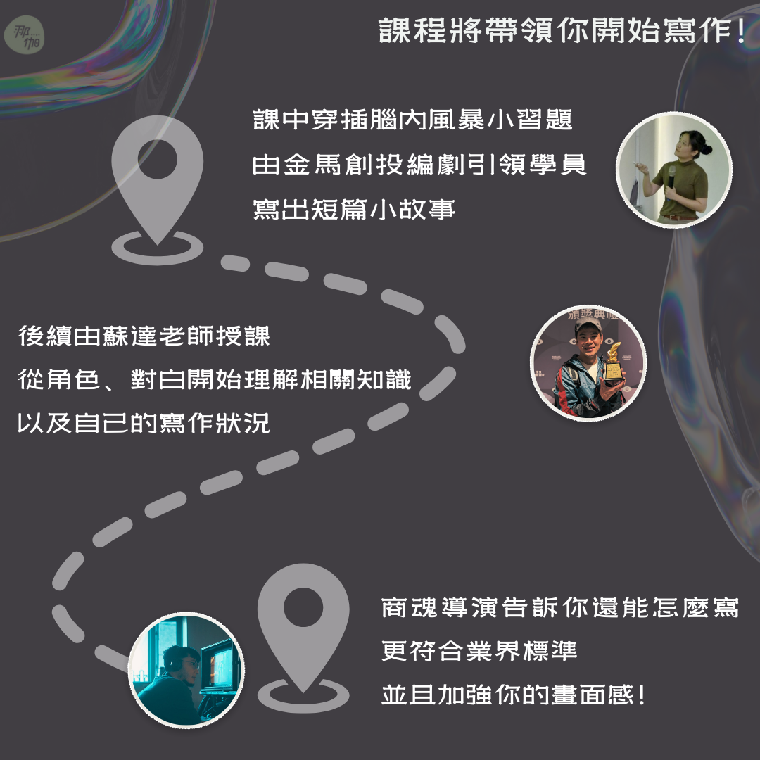編劇課程為初學者提供了為期一個月的的講座,沉浸式的課程,讓學員了解如何成為一名編劇。體驗一下編劇創作思維,了解劇本是如何寫成的、導演是如何轉化劇本、演員是如何演出,讓對編劇有興趣的你,寫出「導演想拍、演員想演的劇本」