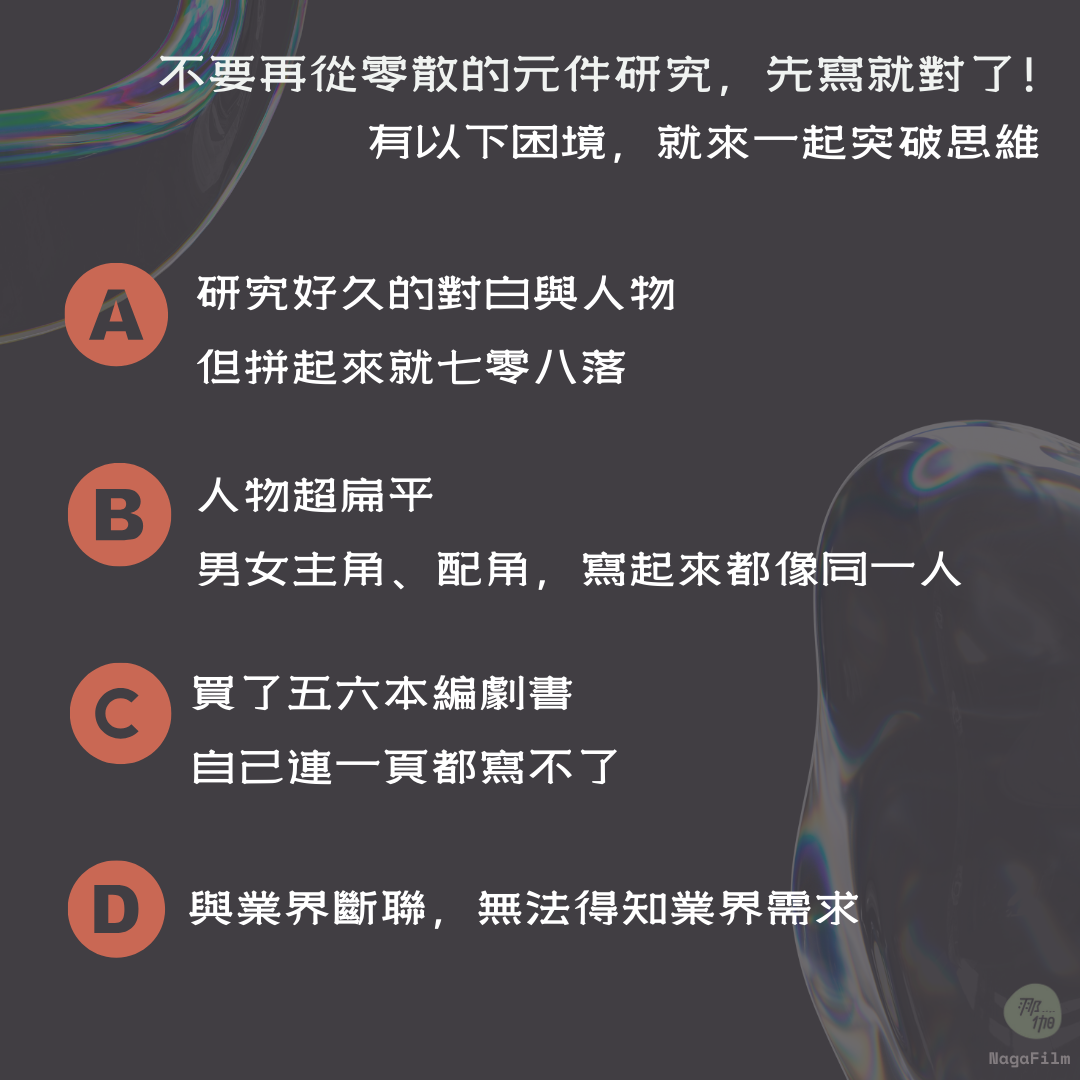 為何敢這麼擔保?因為編劇老師就是這樣改變思路,回想擔任電影副導時在片場的記憶,改善學習邏輯,最終成為了金馬創投編劇!