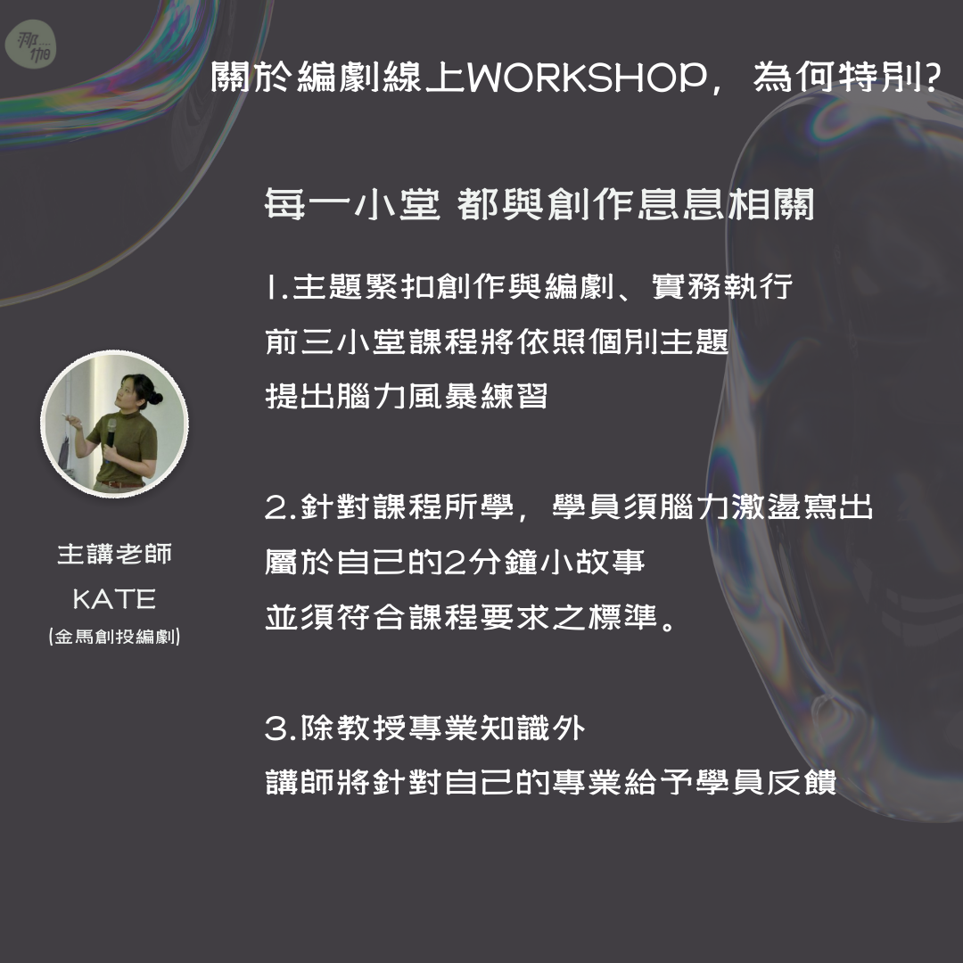 編劇Workshop就是找出屬於你的「創作地圖脈絡」。當你知曉演員如何轉化劇本,片場如何執行劇本內容,塑造人物和故事就不是難事。