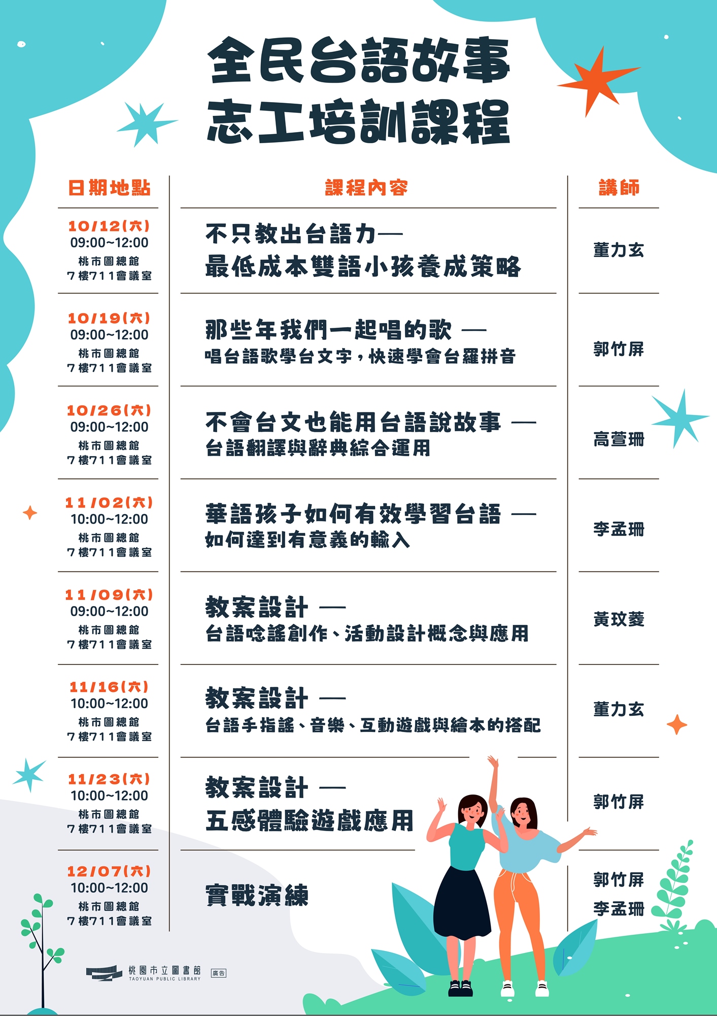 註:最後一堂12/7(六)實戰演練注意事項(1.建議要先上過前面的課程、2.現場會分組準備試教教案、3.帶3本想要講的故事書當教案題材)