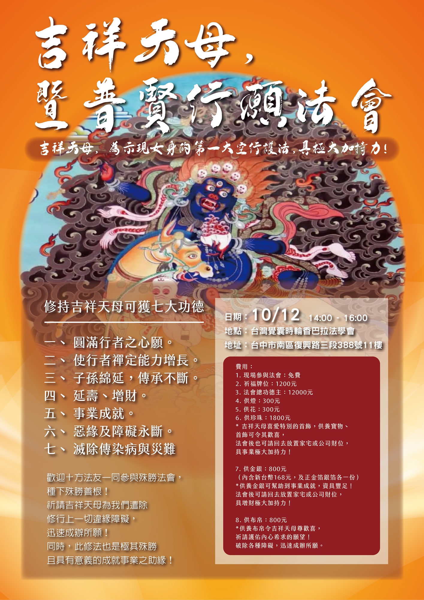 歡迎十方法友一同參與殊勝法會,種下殊勝善根!祈請吉祥天母為我們遣除修行上一切違緣障礙,迅速成辦所願!