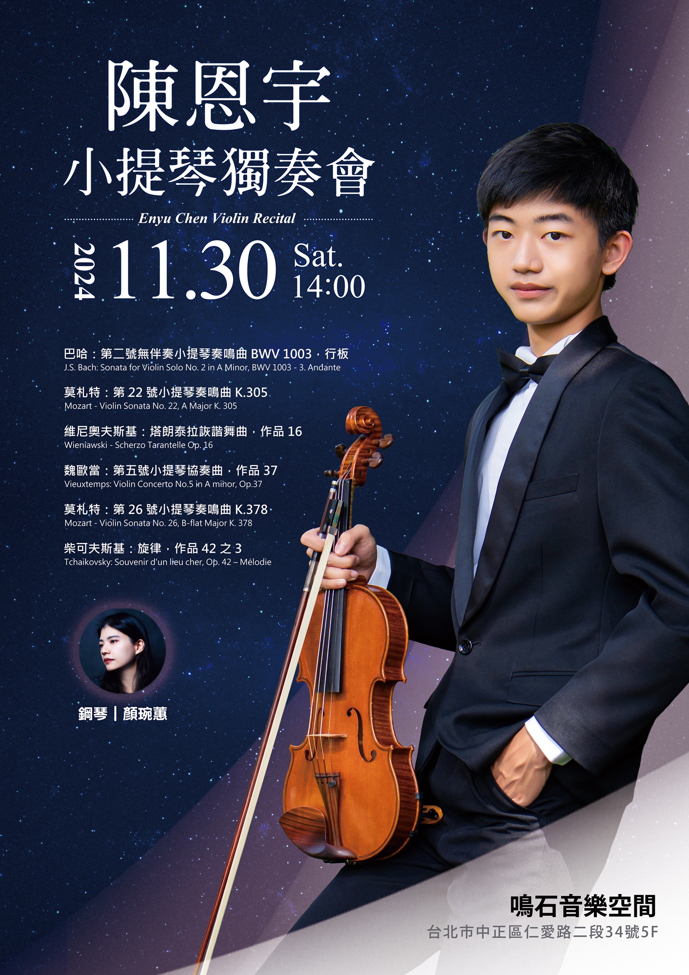 這是恩宇首次舉辦個人獨奏會,也是他音樂旅程上的一次成果展現與自我挑戰。本場音樂會曲目,從古典橫跨浪漫,恩宇將演奏巴哈、莫札特、維尼奧夫斯基等大師的經典作品,誠摯邀請您前來聆聽欣賞。恩宇期許自己能將音樂與社會公益結合,這場售票音樂會的收入,將全數捐贈社福機構。