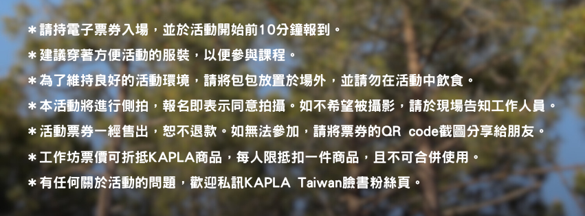 主辦單位保有最終修改、變更、活動解釋及取消本活動之權利,並得視天候、現況調整活動內容之權利,如有任何變更,將以KAPLA Taiwan臉書粉絲頁公告。