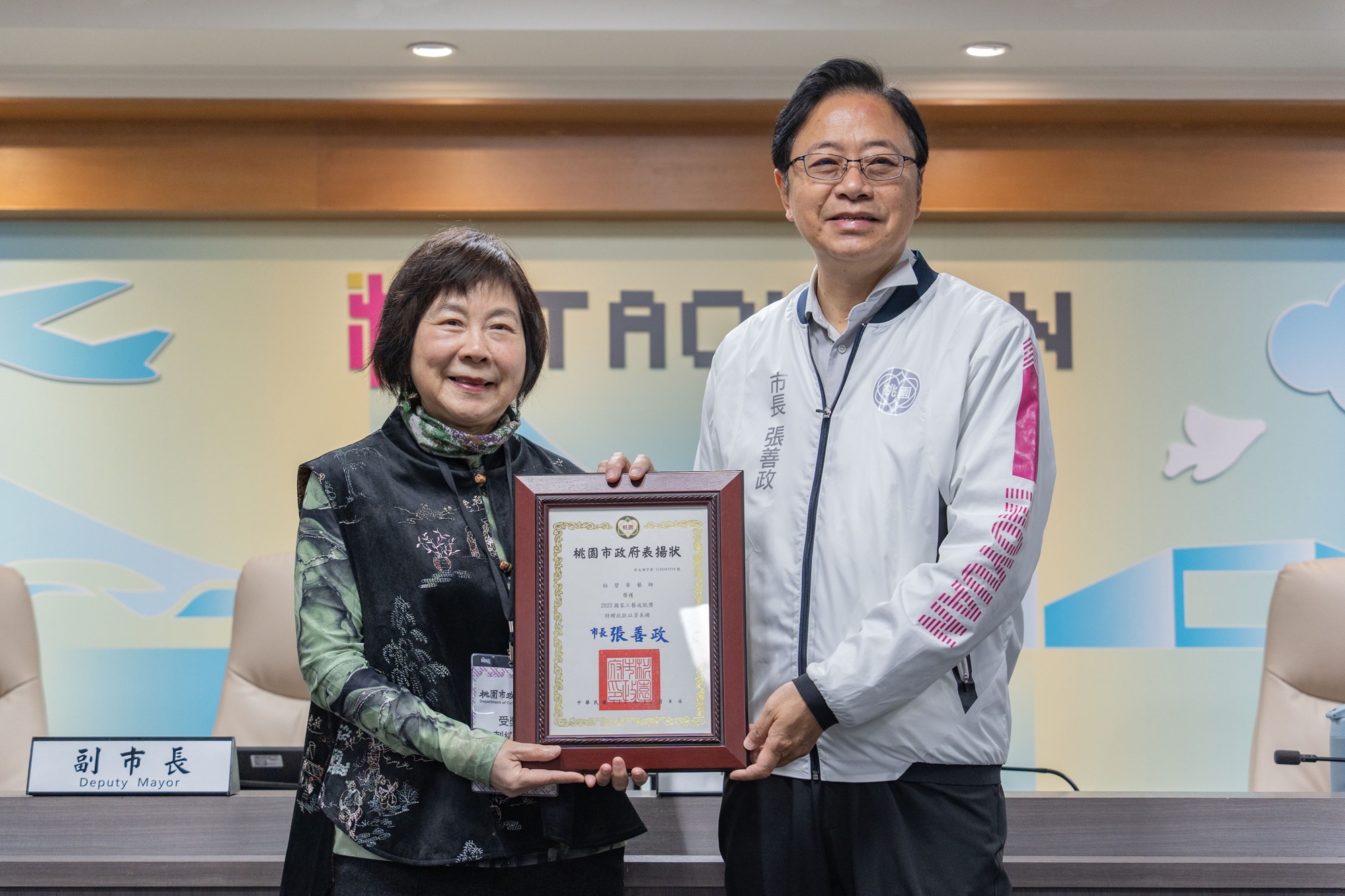 2023年桃園市政府文化局推薦在地藝術家粘碧華,獲得了臺灣工藝領域最高榮譽的「國家工藝成就獎」,這是自2007年該獎辦理至今,首次有女性得獎者,表彰粘碧華長期致力於推廣及保存刺繡傳統外,也在創新發展上不停精進。