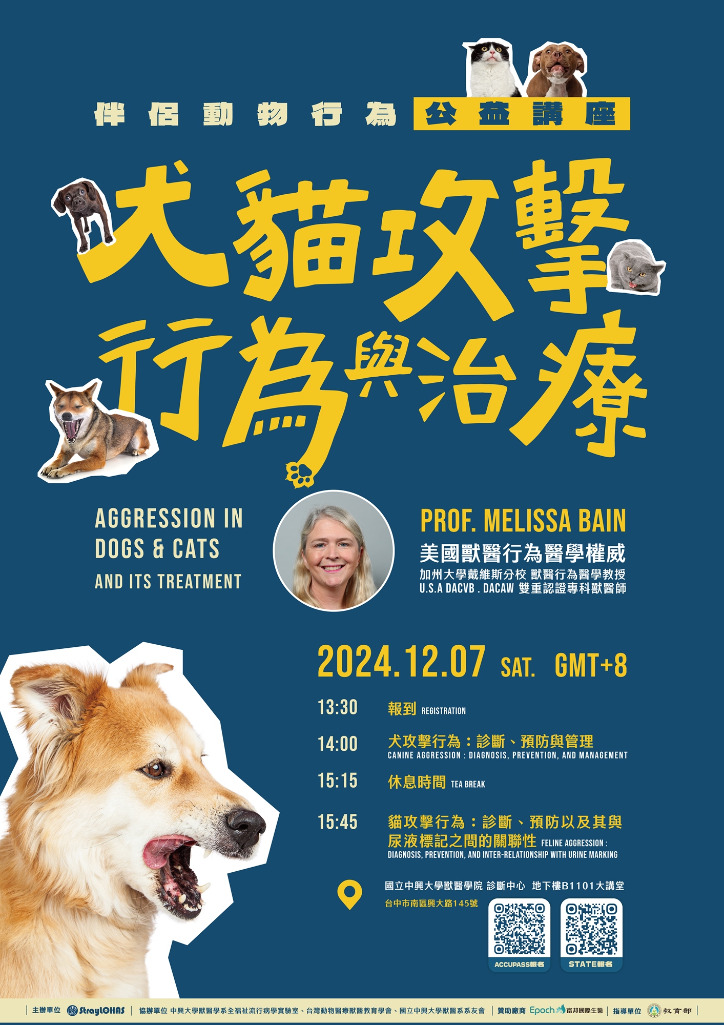 本次公益講座由中興大學USR專案「浪愛無國界:流浪動物減量與福祉實踐」主辦,並由中興大學獸醫學系全福祉流行病學實驗室、台灣動物醫療獸醫教育學會、與國立中興大學獸醫系系友會協辦,以及富邦國際生醫科技有限公司贊助。