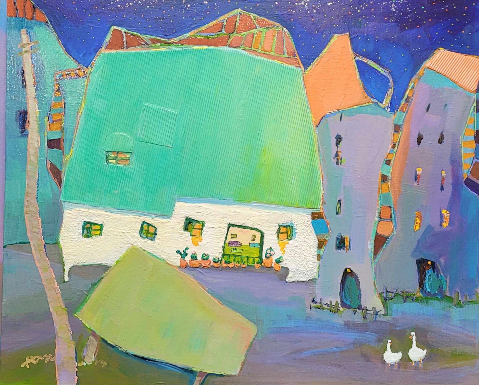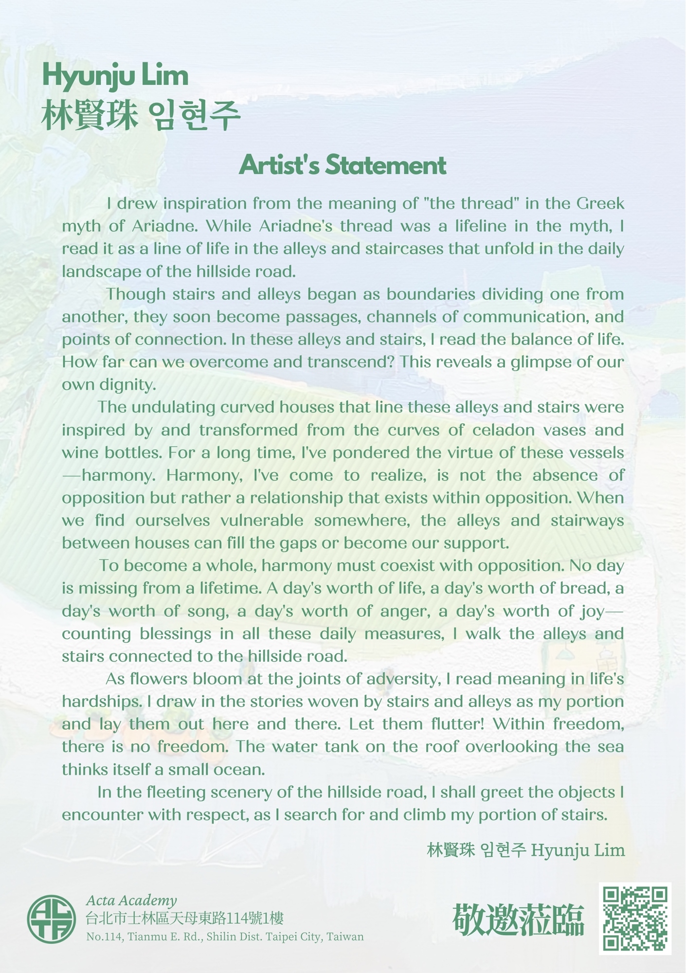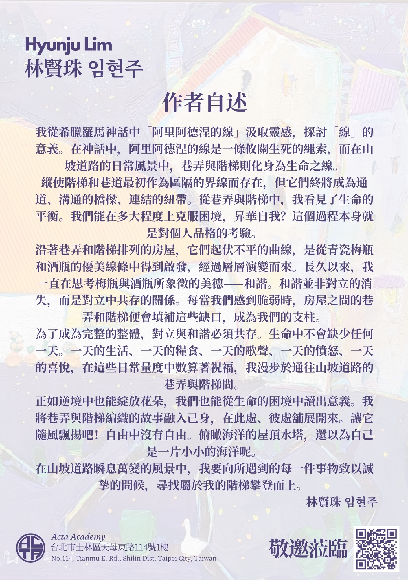 一起品茗、母親等待孩子放學、夜深人靜時漫步城市街頭——這些日常時刻構成了我們美好生活的織錦,將我們彼此相連。她的藝術以家鄉釜山風景的柔和色彩,以及家庭中鵝群簡單的生活場景,喚起了懷舊、奇思和歸屬感。這些情感呼應了林賢珠的藝術理念:「我希望能創作出與最小、最低、最受傷的事物同行的作品。」在這個大世界中,我們有時都會感到渺小,而林賢珠提醒我們,我們的生活僅僅因為存在就已經是奇蹟。她那迷人的彎曲小巷和蜿蜒樓梯不僅是藝術選擇;它們是人生旅途的隱喻,告訴我們往往是意想不到的轉折帶來最有意義的連結。