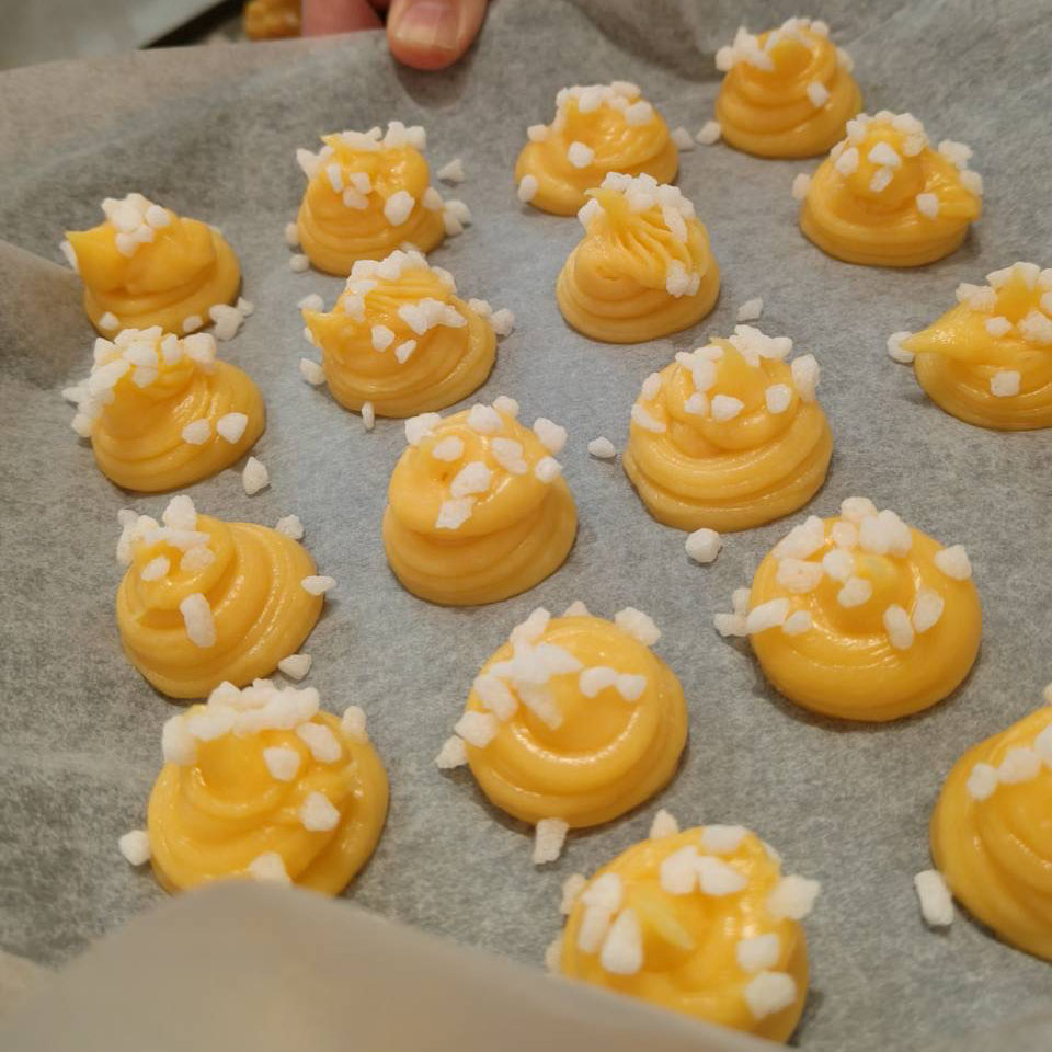 想不到簡單的材料,呼嚕嚕嚕嚕的就能變出一顆顆的小泡芙,造型隨著自己動手操作而有不同的變化,小巧可愛的小泡芙撒上珍珠糖,送入烤箱後,變成香甜可口的小點心,讓人一口接一口。
