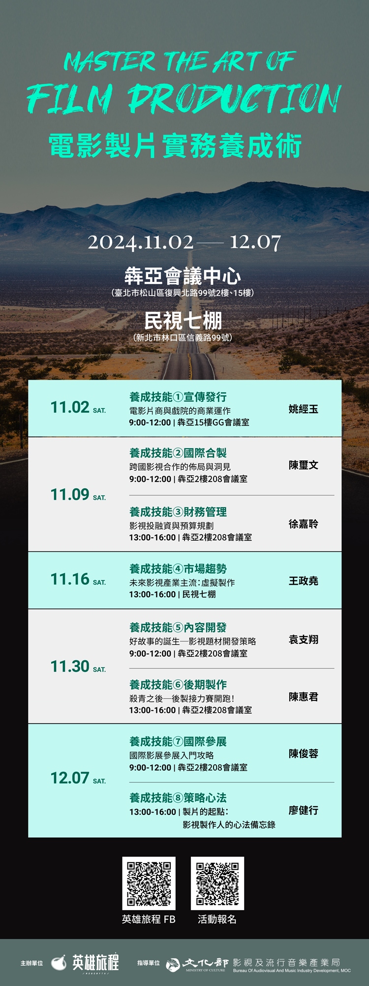 電影作為集體創造而生的文化產物,在製片的運籌帷幄之下,融合文化意涵與商業考量的綜整思維,型塑了不同的電影樣貌。製片是產製電影的核心人物,是孵化電影的重要舵手,在電影的市場洞察與創意開發中扮演舉足輕重的角色,在電影製作的各個環節裡,製片的各種評估與考量,所做的每一個關鍵決策終將影響作品的呈現,他帶領整個創作團隊完成作品,更是最後離開的人物。製片將天馬行空的創意點子,幻化為實際可製作的電影概念,不管是以獲利為考量的商業賣座鉅片,或是以創意為主導的實驗風格藝術片,製片皆是電影的靈魂人物!