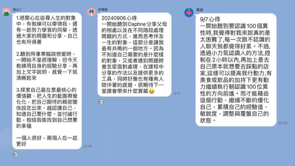 我擅長用我的行銷溝通的專業能力,與理性助人成長的特質,特別在面對自雇者或單身專業人士時,分享如何以個人優勢成功經營事業與人際關係。我用心發掘並培養你的優勢,幫助你們專注於目標,在脫單的旅程保持積極向上的心態,在每一步中給予溫暖的支持與鼓勵,100%的來成就你。