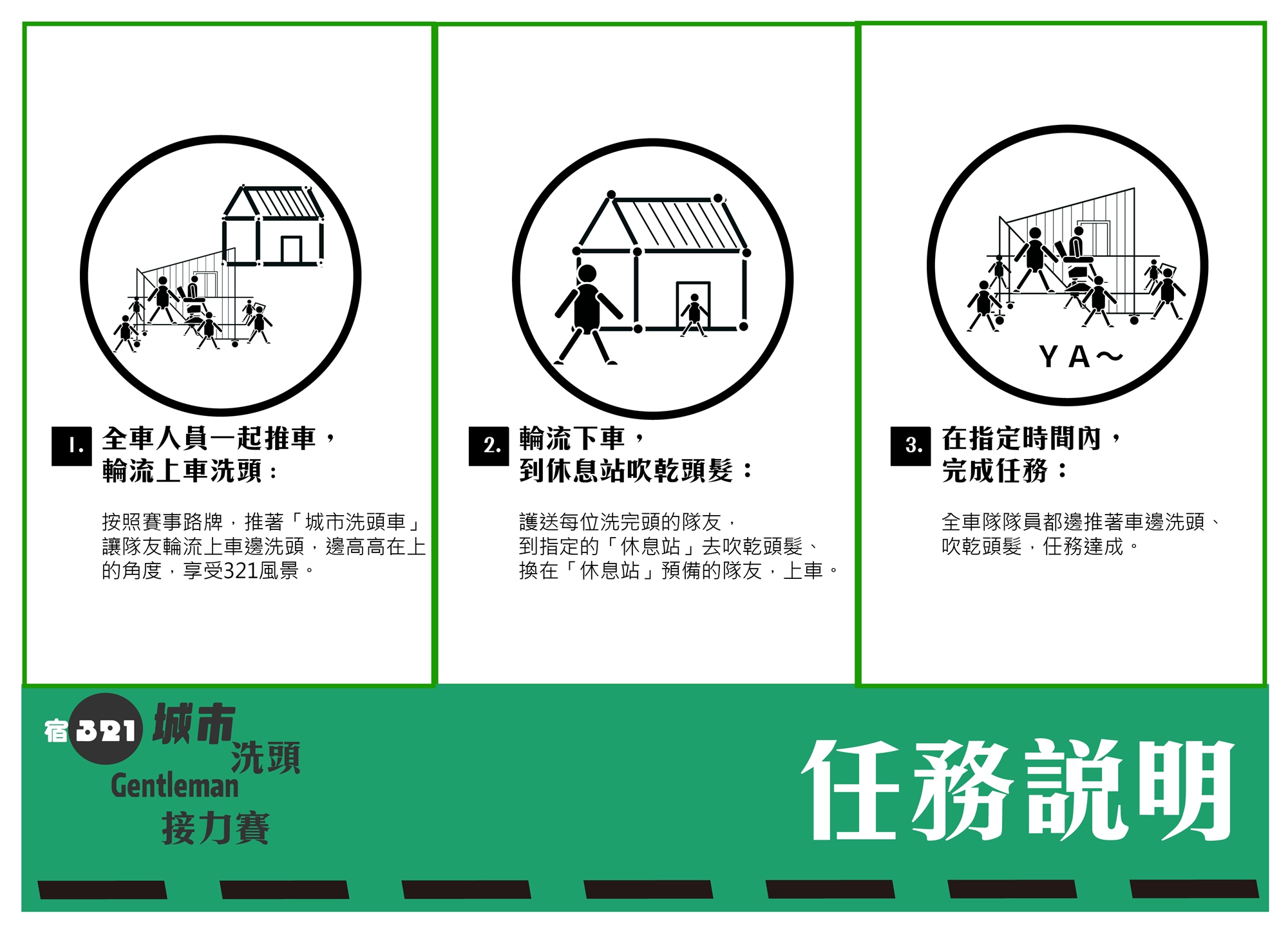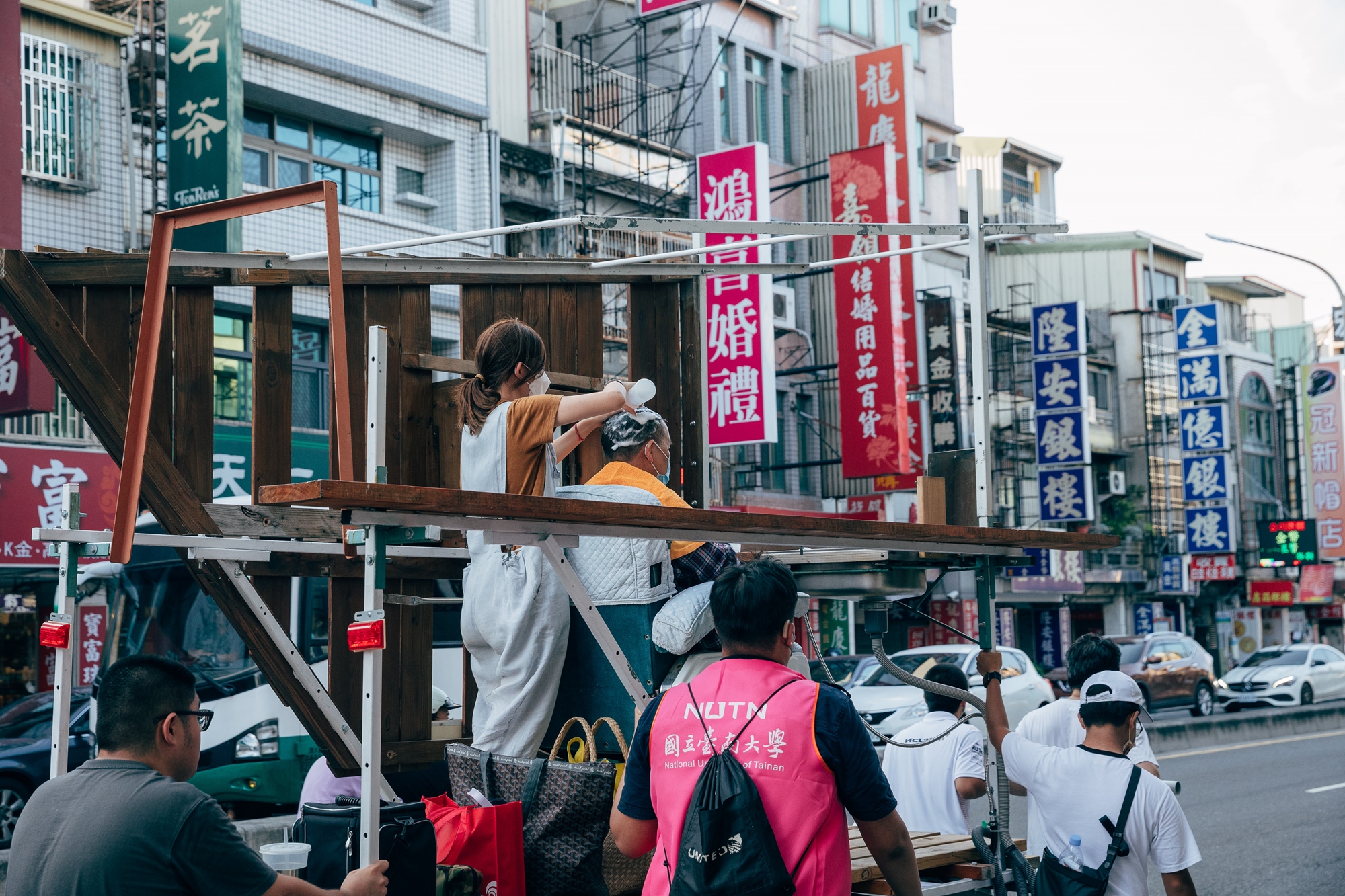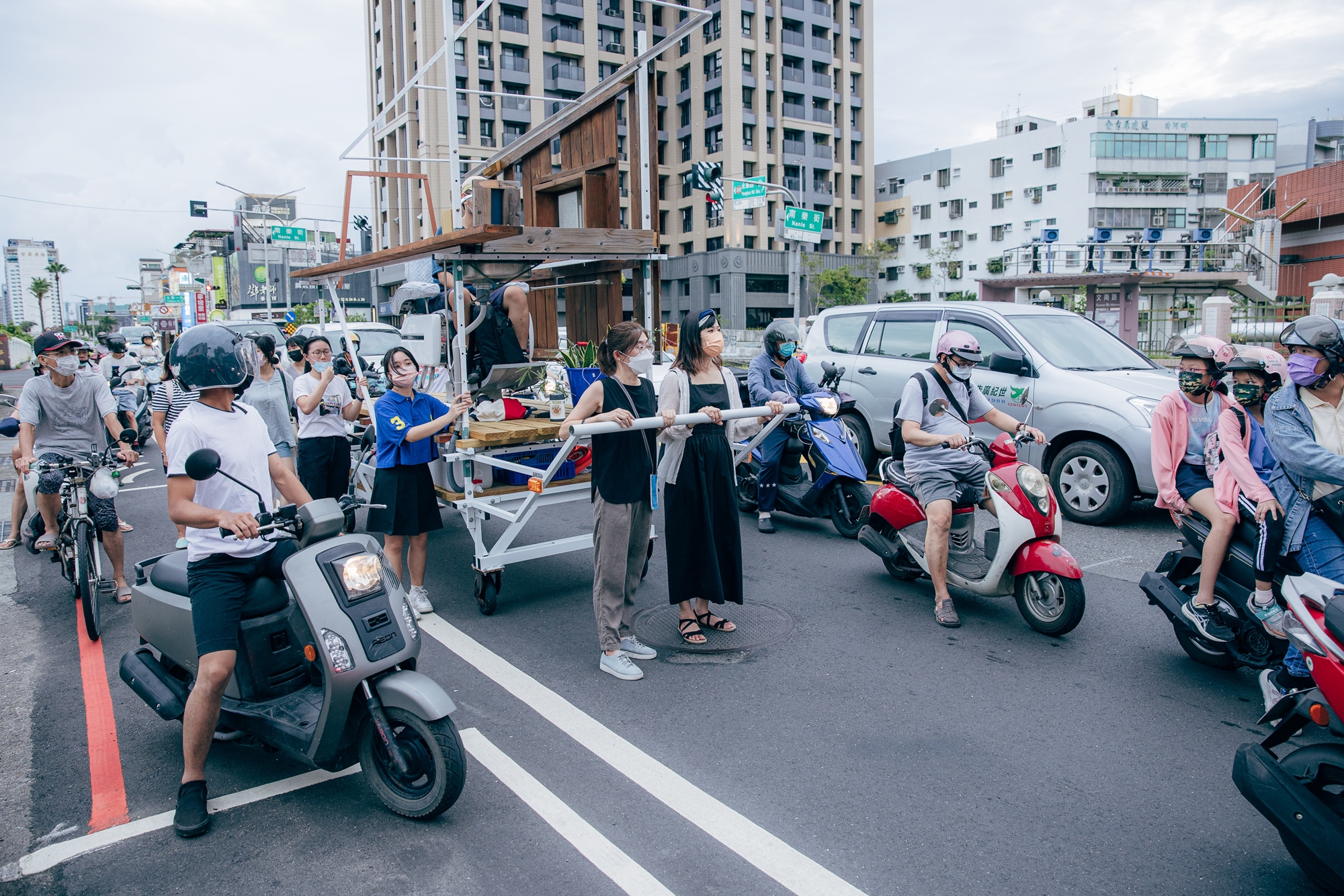 「跟一群人像廟會遶境般,輪流推著近一層樓高的洗頭車,走在路上。」