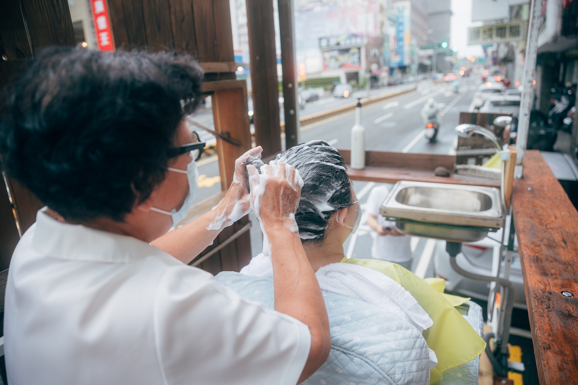 「坐在戶外洗頭,高高在上被隊友推著眺望321巷陽光撒落在樹蔭屋瓦間風景,奇特體驗。」