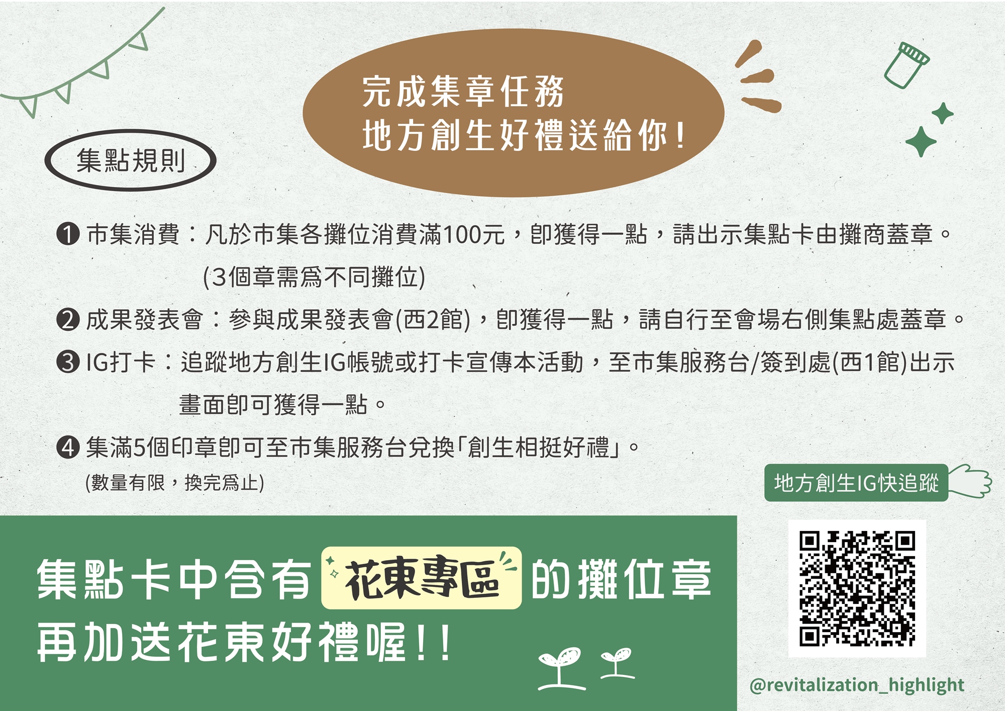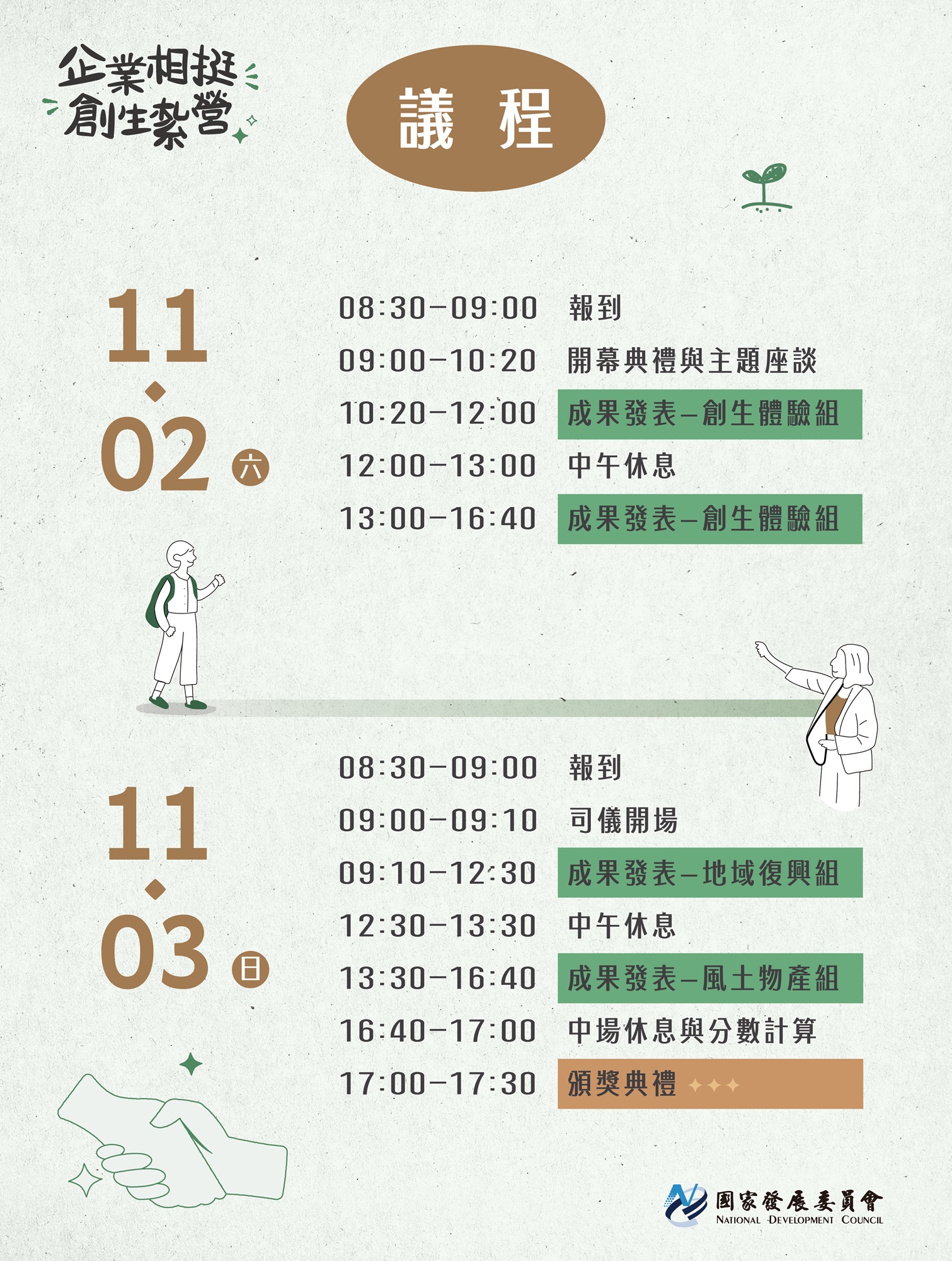 國家發展委員會於113年11月2日(星期六)至11月3日(星期日)舉辦「獎勵青年投入地方創生行動成果發表會暨市集」,將展現團隊們努力的成果,誠摯邀請蒞臨指導。