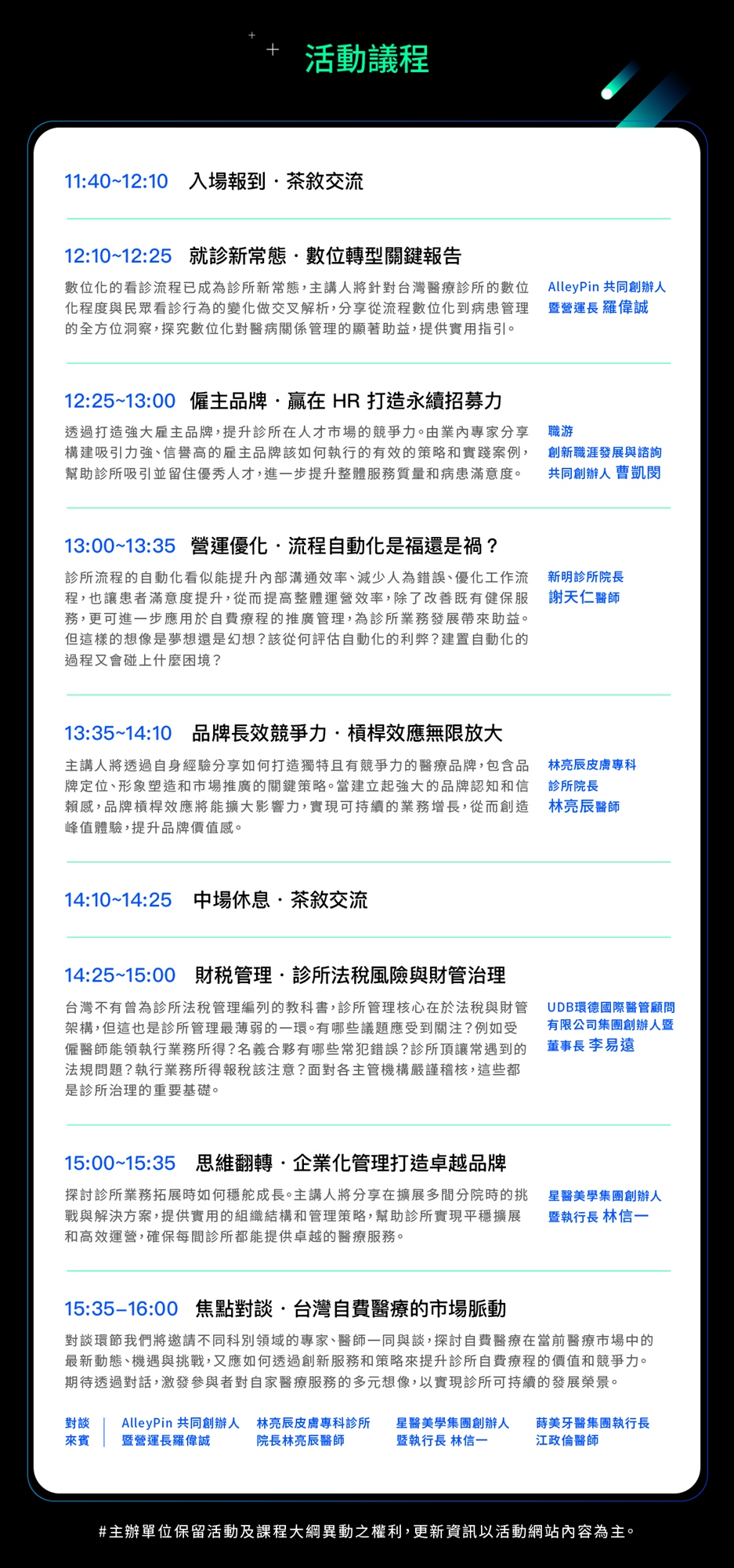 13:35-14:10 品牌長效競爭力・槓桿效應無限放大 - 林亮辰皮膚專科診所 院長林亮辰醫師主講人將透過自身經驗分享如何打造獨特且有競爭力的醫療品牌,包含品牌定位、形象塑造和市場推廣的關鍵策略。當建立起強大的品牌認知和信賴感,品牌槓桿效應將能擴大影響力,實現可持續的業務增長,從而創造峰值體驗,提升品牌價值感。