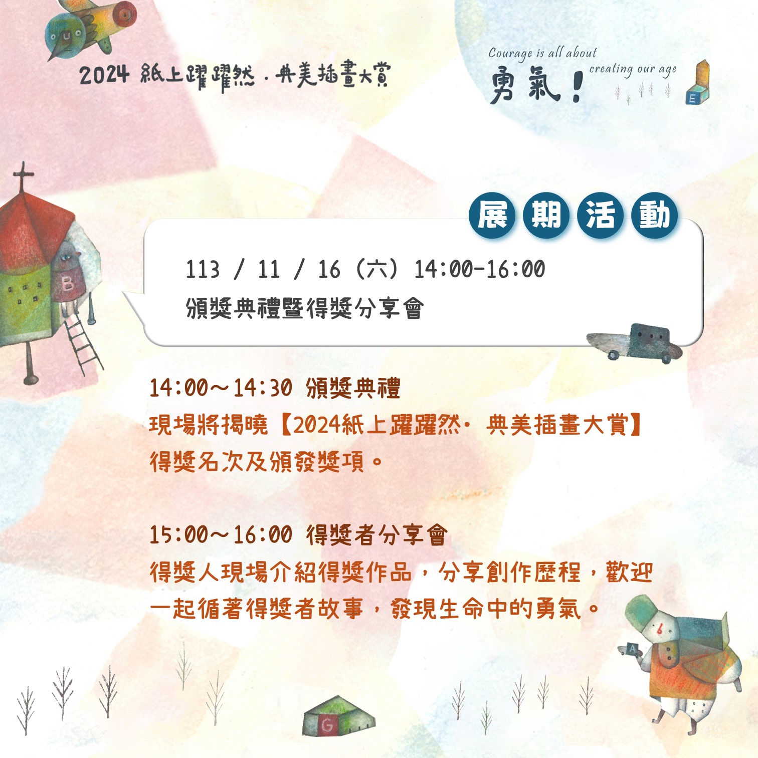 現場將揭曉【2024紙上躍躍然.典美插畫大賞】得獎名次,並邀請得獎人現場分享創作歷程,歡迎一起循著得獎者的故事,發現生命中的勇氣。