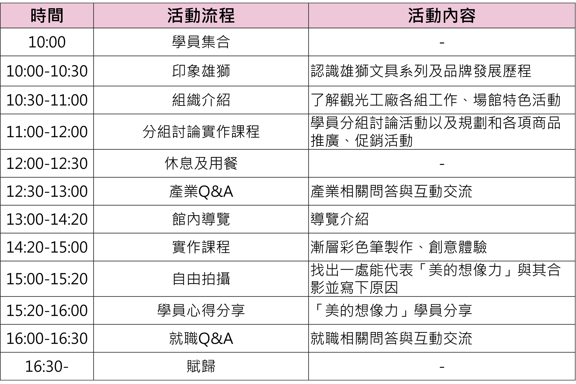 本次體驗榮幸邀請到-陳品存副理,帶領學員們認識雄獅文具系列、觀光工廠場域到品牌發展歷程,並讓學員們發覺美感與創意體驗、漸層彩色筆製作與演練規劃商品行銷活動,從產品製作到行銷的一條龍體驗,打造完整且成就探索創意、孕育美感的「想像力製造所」職場體驗。