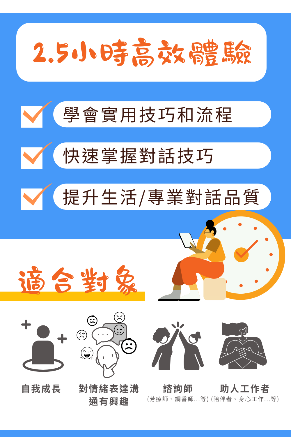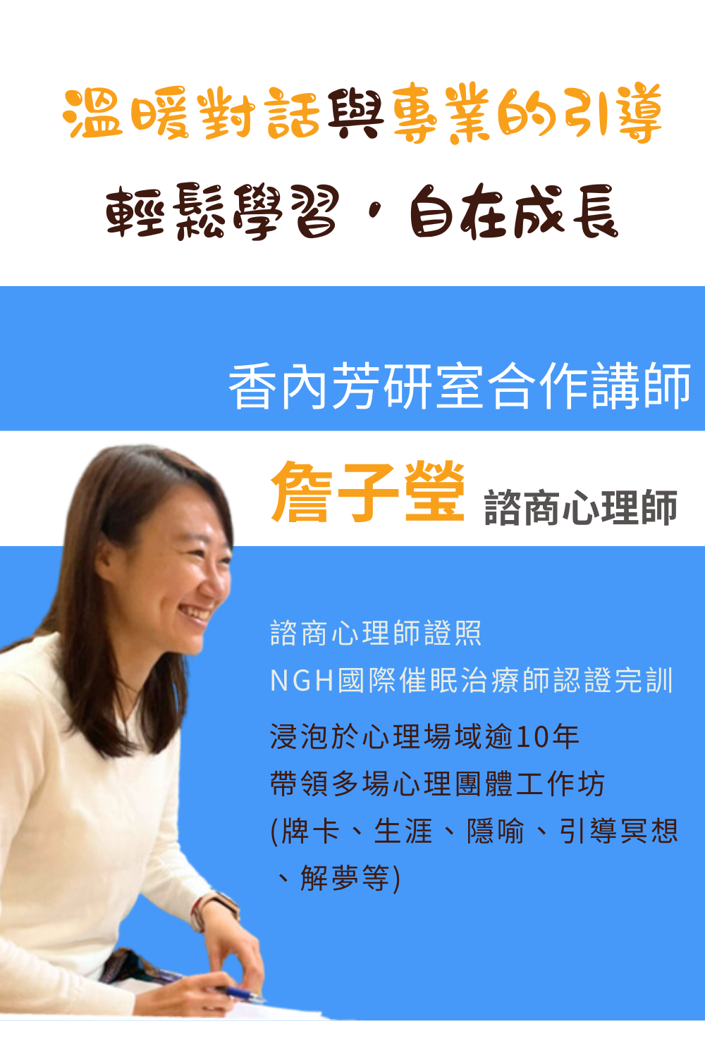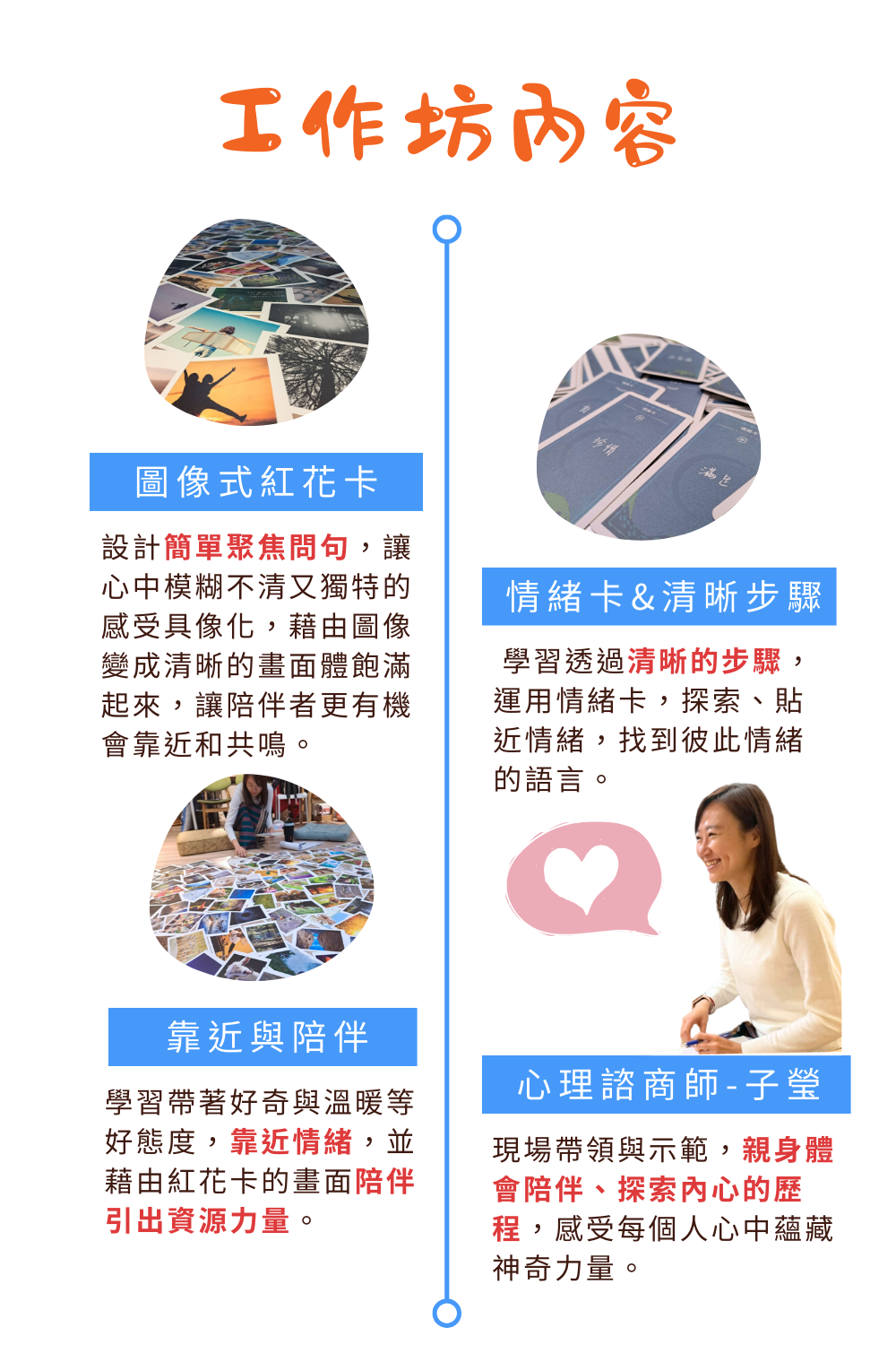 在這個2.5小時的牌卡體驗工作坊裡,子瑩心理師會透過陪伴大家透過清晰的步驟和流程,親身體驗與學習如何藉由情緒卡和小紅花這兩個超級實用又容易上手的牌卡工具,作為開啟對話的橋樑和靠近情緒的階梯,為你的專業對話加分!擁有一個清晰的路徑,溫柔搭起彼此對話和理解的橋樑,也陪伴眼前的人靠近自己的心。