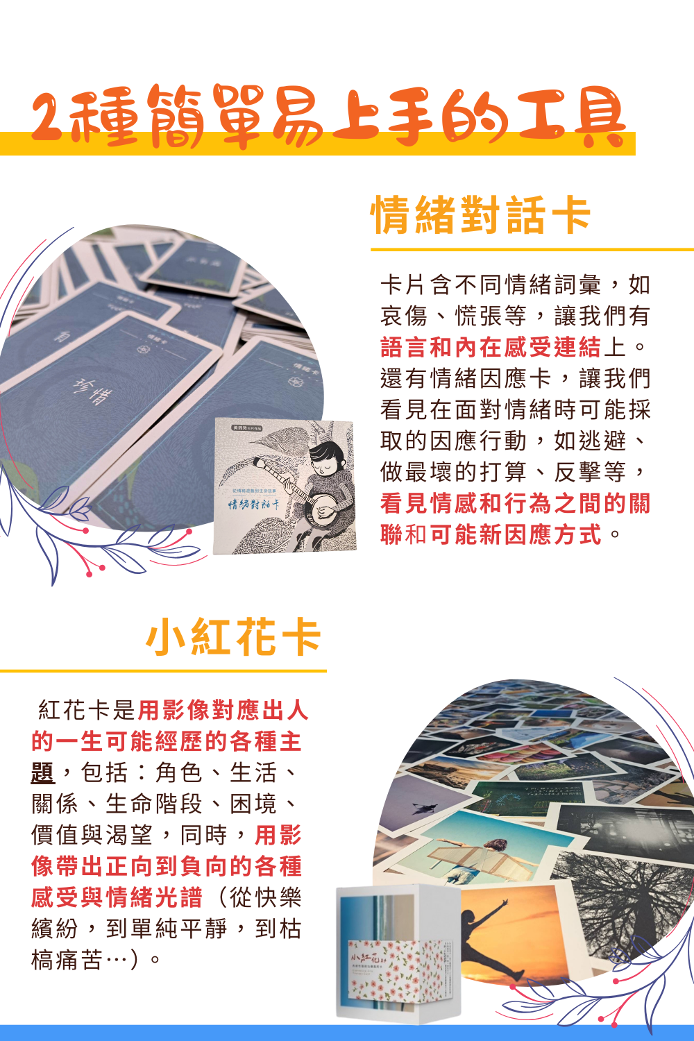 想要表達自己的感受,卻找不到語言讓對方理解,或者,試圖更理解對方的感受,卻毫無頭緒不知從何開始對話時,操作簡單容易上手的圖像式的紅花卡,搭配清晰文字的情緒卡,將會是你最得力的小幫手!