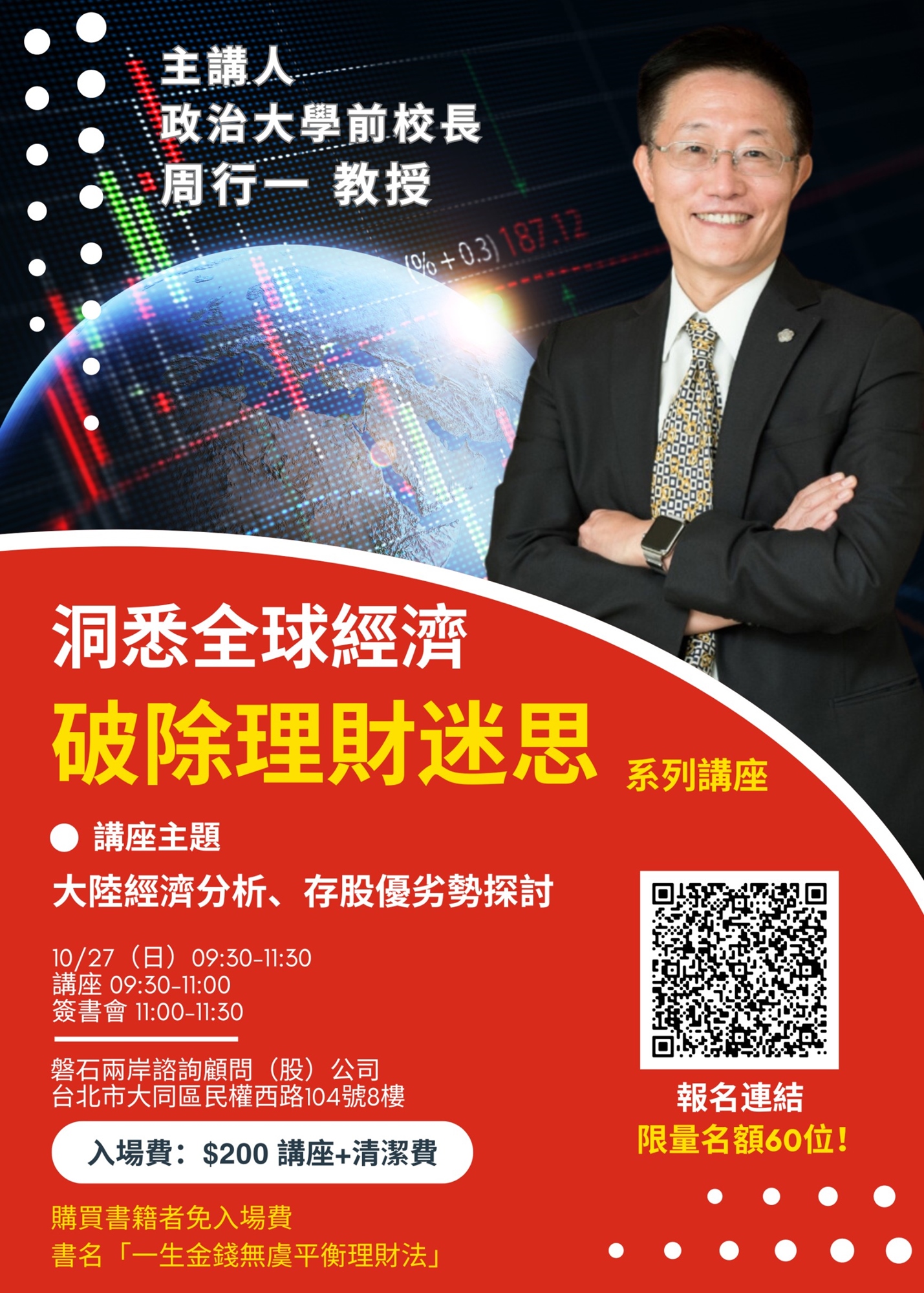 在這場講座中,周教授將帶領我們一起頗析全球經濟,特別是中國近期祭出經濟刺激組合拳,對市場能產生實質的變化嗎?又是否適合進場投資?存股的優劣勢是什麼?歡迎參加本次講座,與我們一起強化你的理財思維!