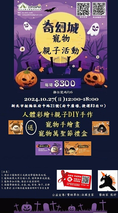 毛孩參加~來就送寵物手繪畫和寵物萬聖節禮盒,報名前10名的毛孩可獲得呆呆綠巨人,驚魂小亡靈,黑炭獨眼怪,神袐木乃伊,萌萌黑蜘蛛!拔拔麻麻快帶您的毛孩來玩喔!讓您寵愛的毛活得更快樂, 讓沒有家的毛孩有個家