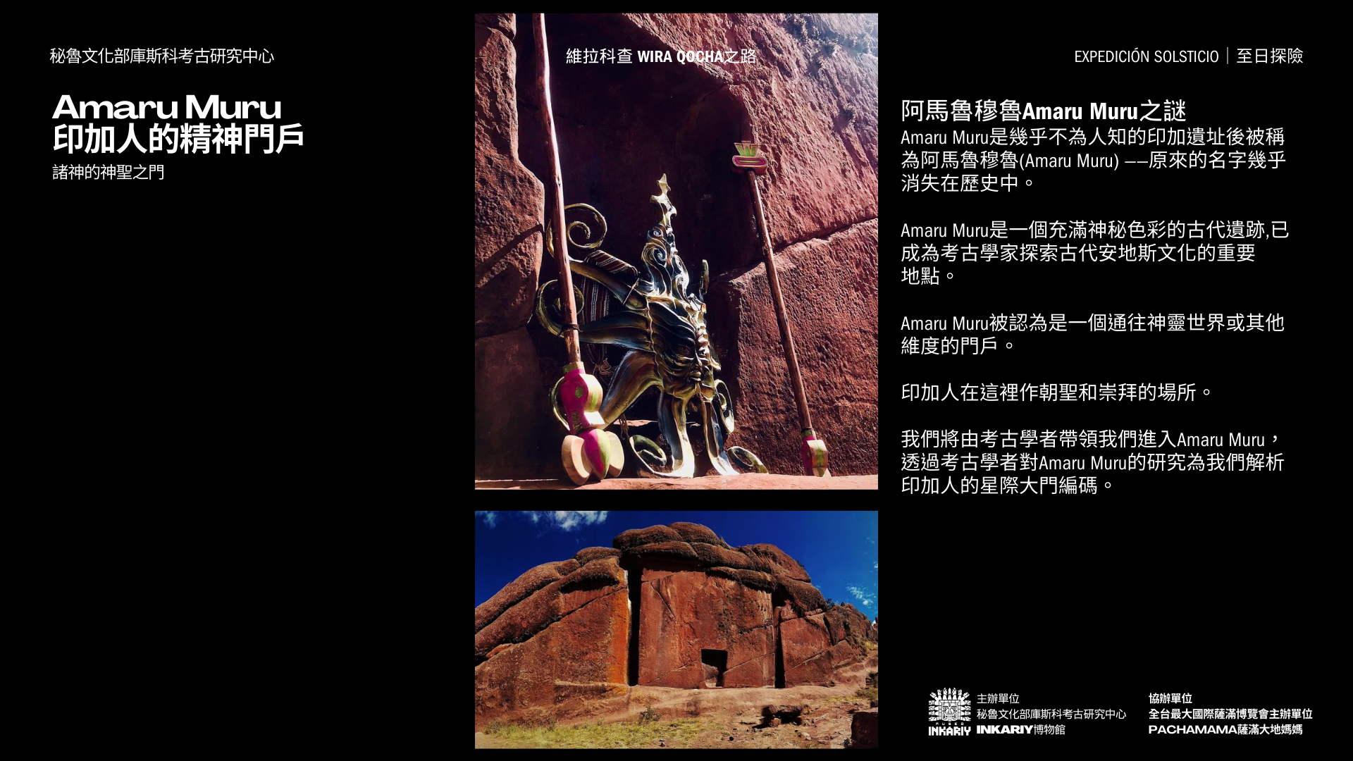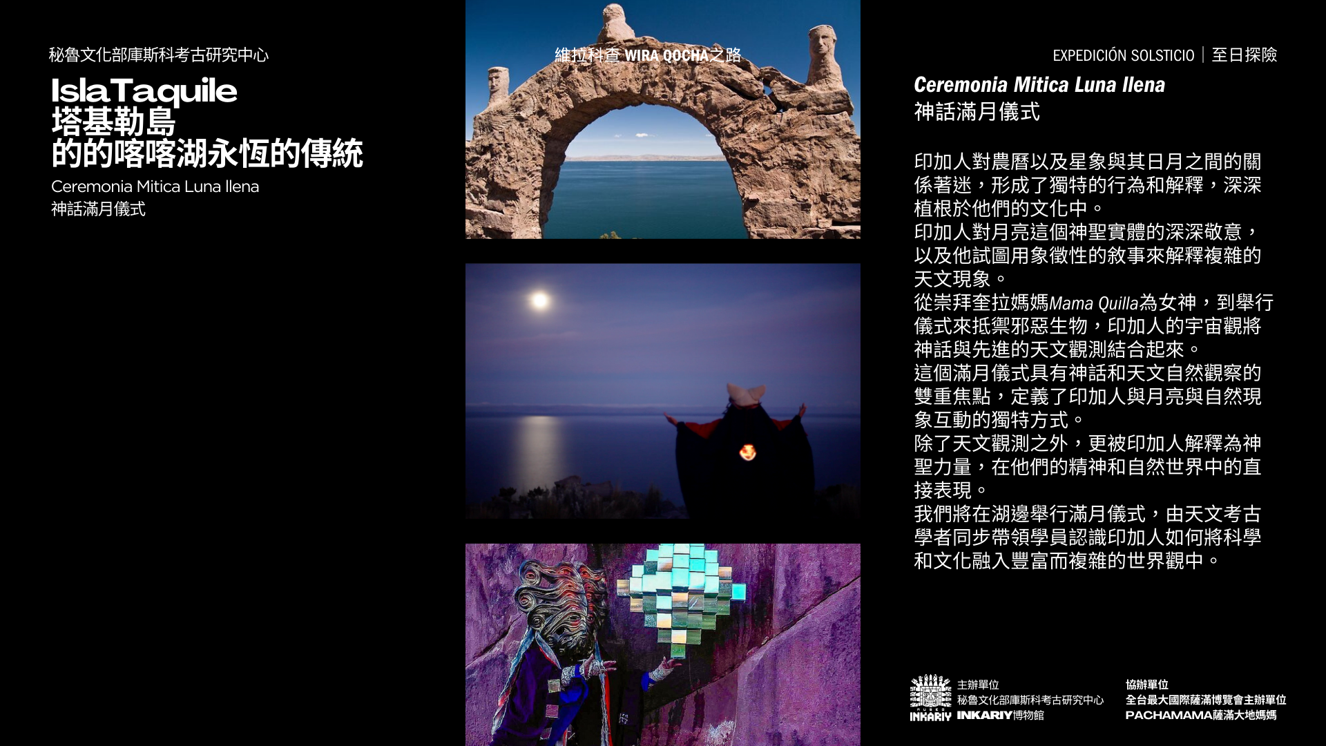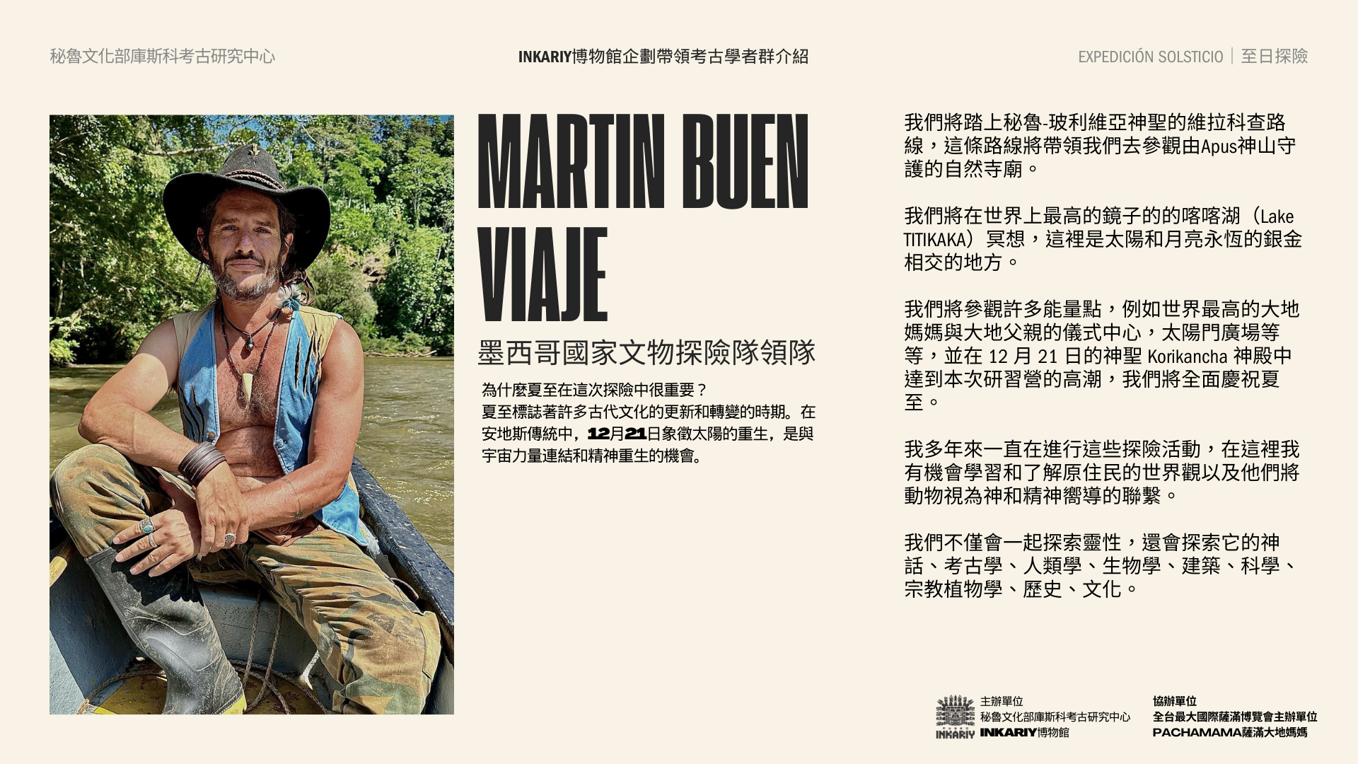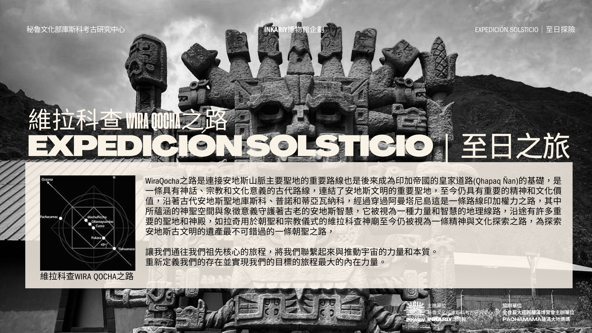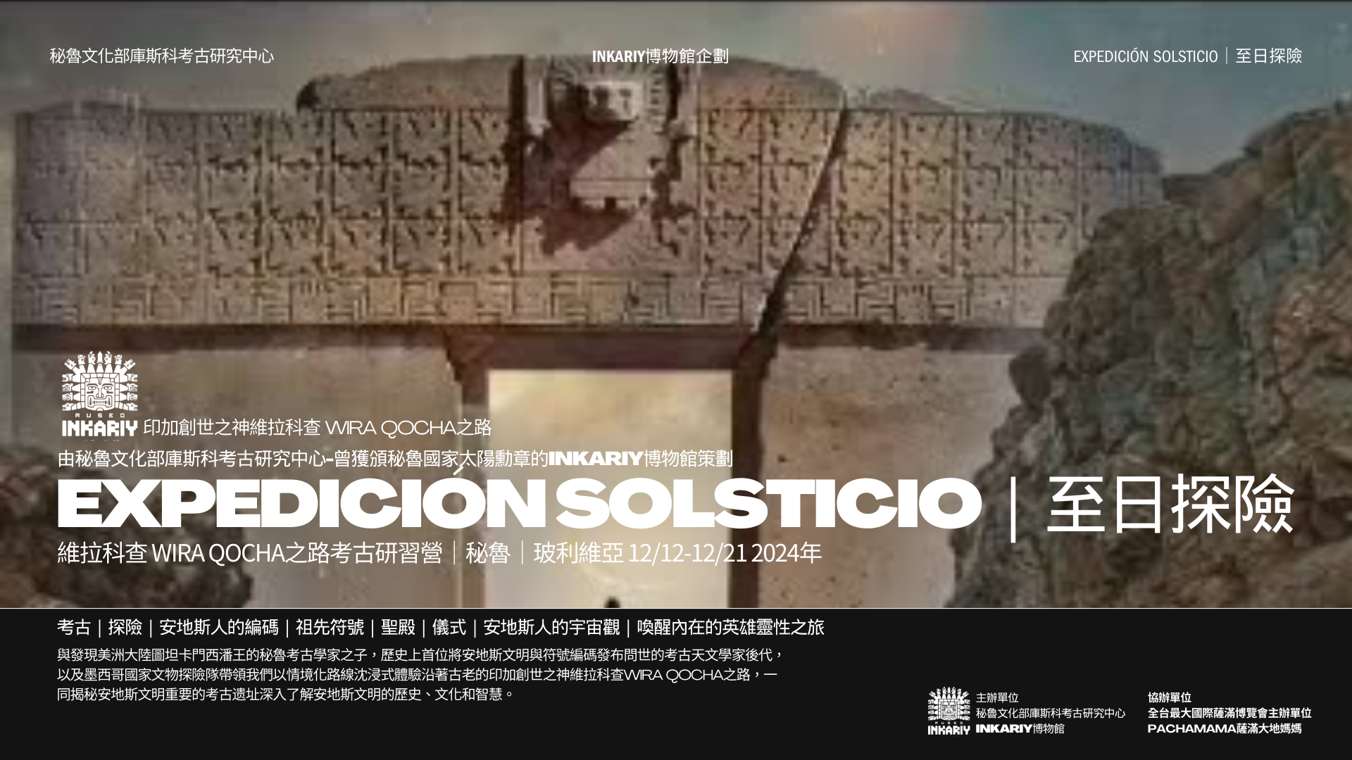 與發現美洲大陸圖坦卡門西潘王的秘魯考古學家之子,歷史上首位將安地斯文明與符號編碼發布問世的考古天文學家,以及墨西哥國家文物探險隊帶領,以情境化路線沈浸式體驗沿著古老的印加創世之神維拉科查Wira Qocha之路,ㄧ同親臨安地斯文明重要的考古遺址,探索安地斯文明的最重要的神話考古遺跡,通往安地斯祖先核心,將我們與推動宇宙的力量和本質