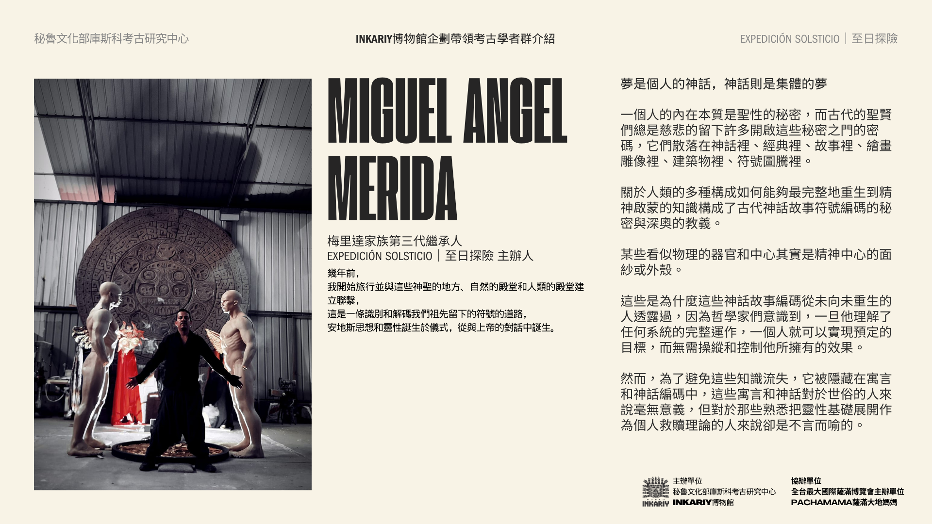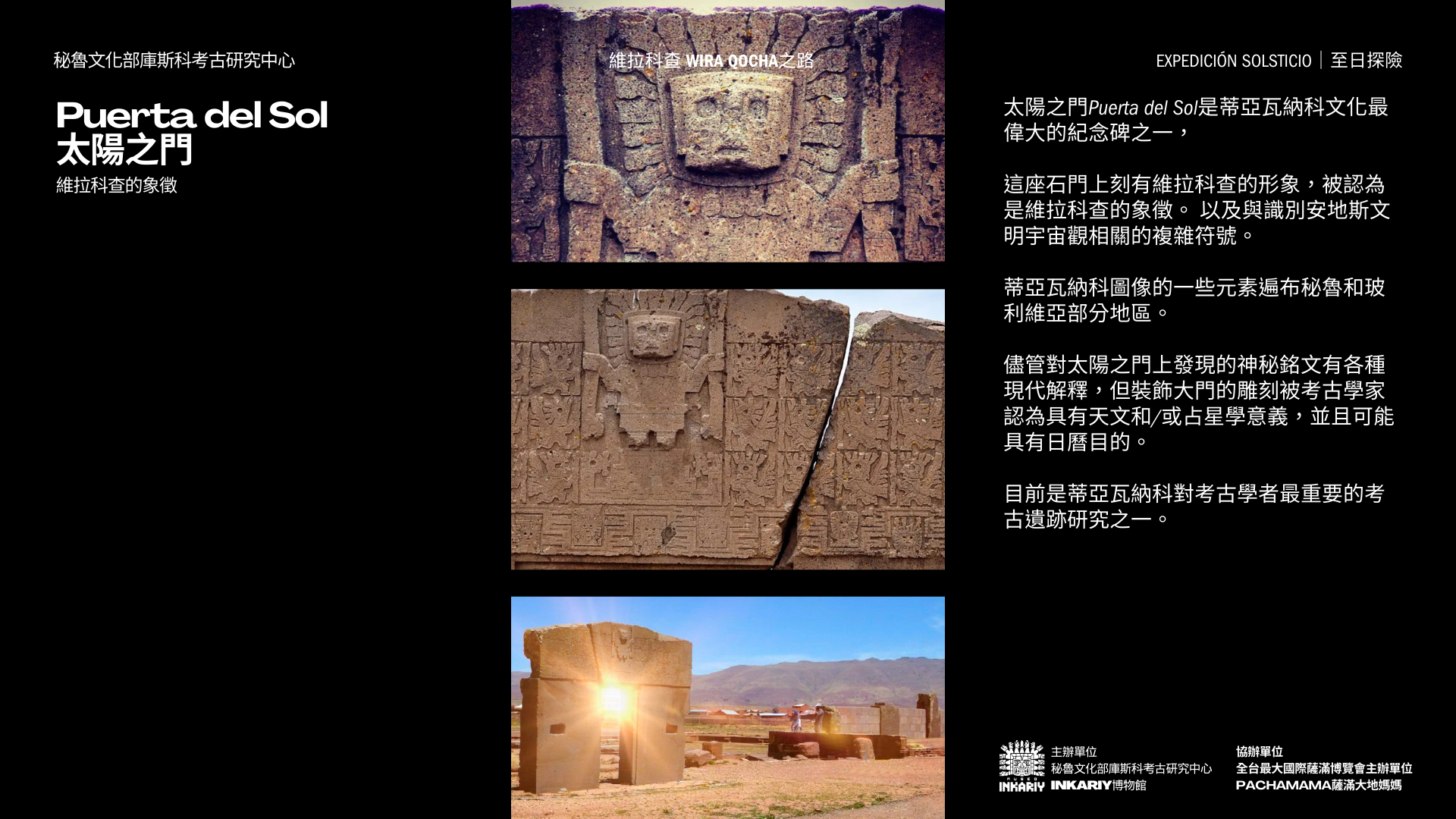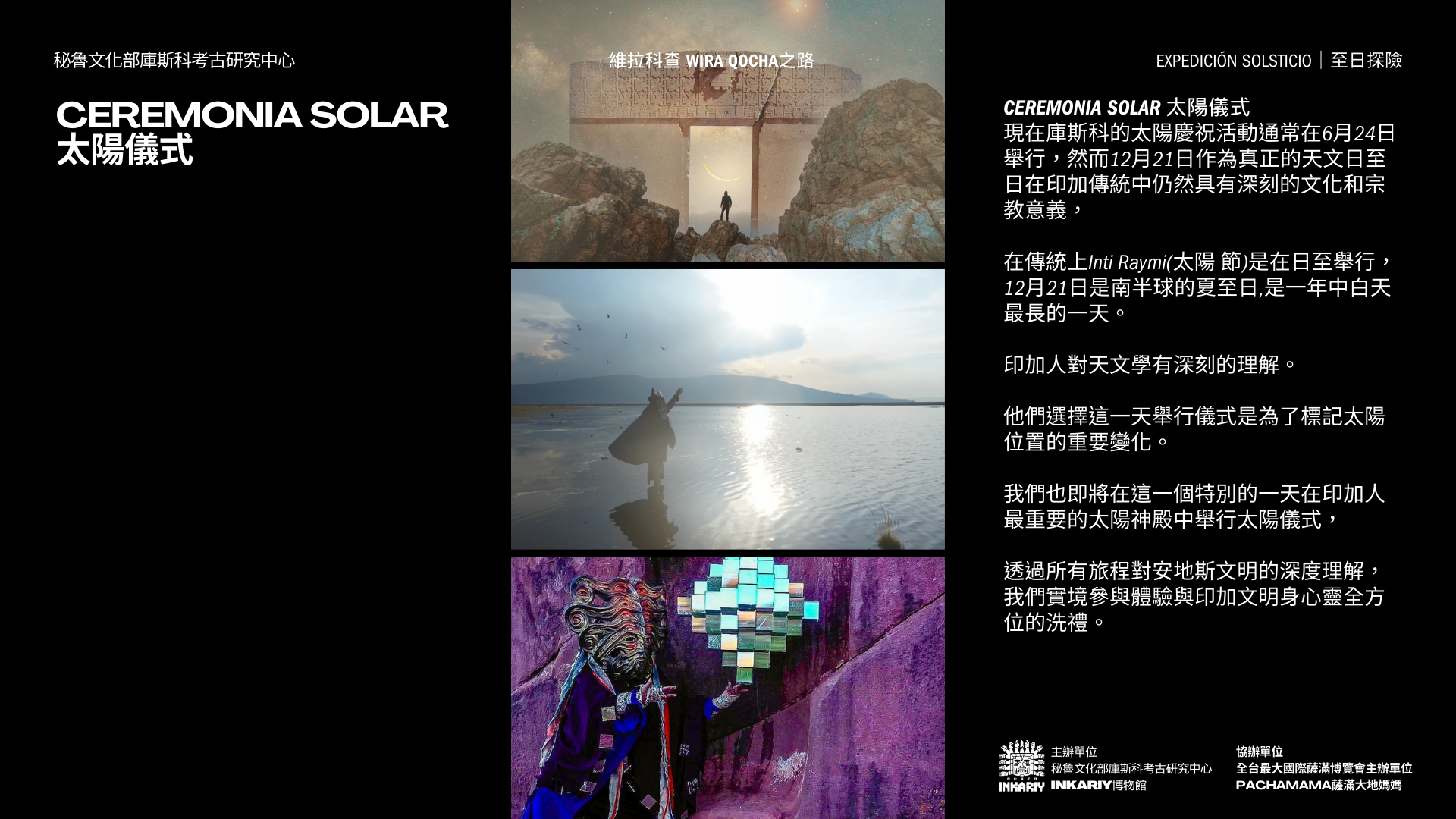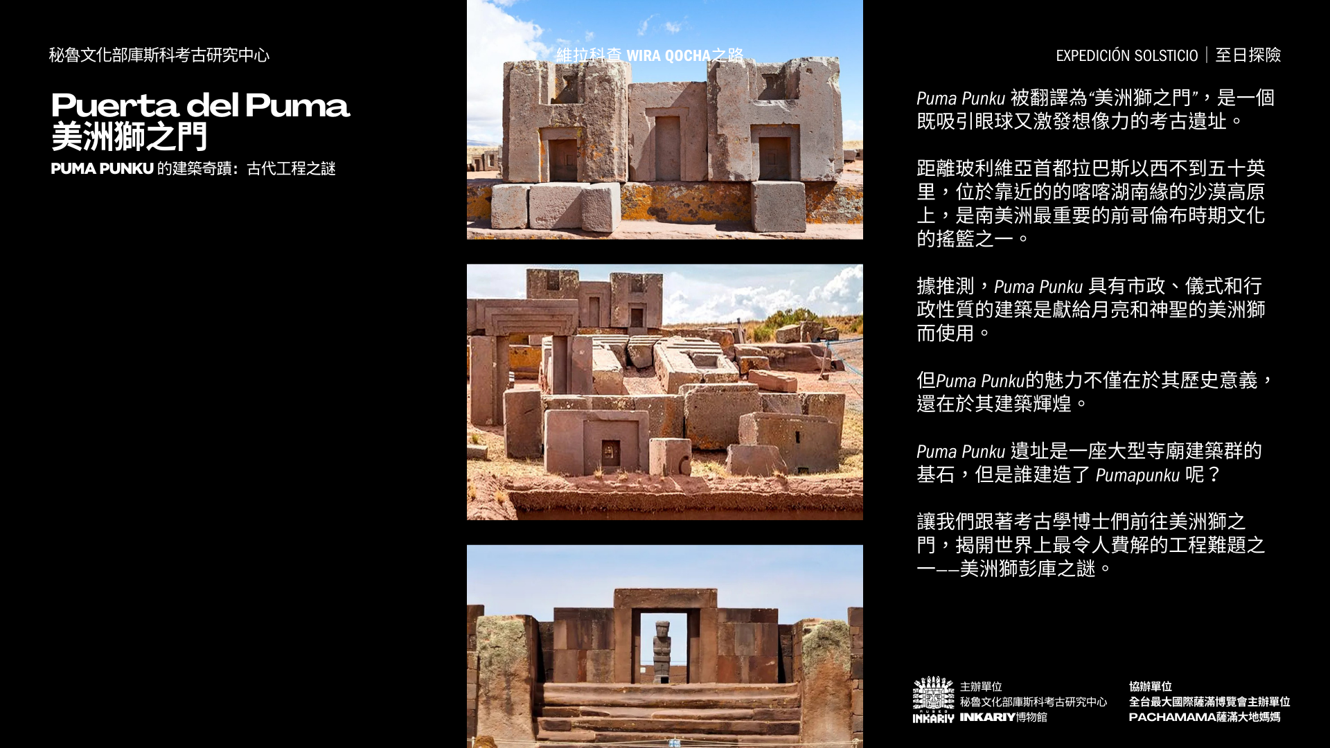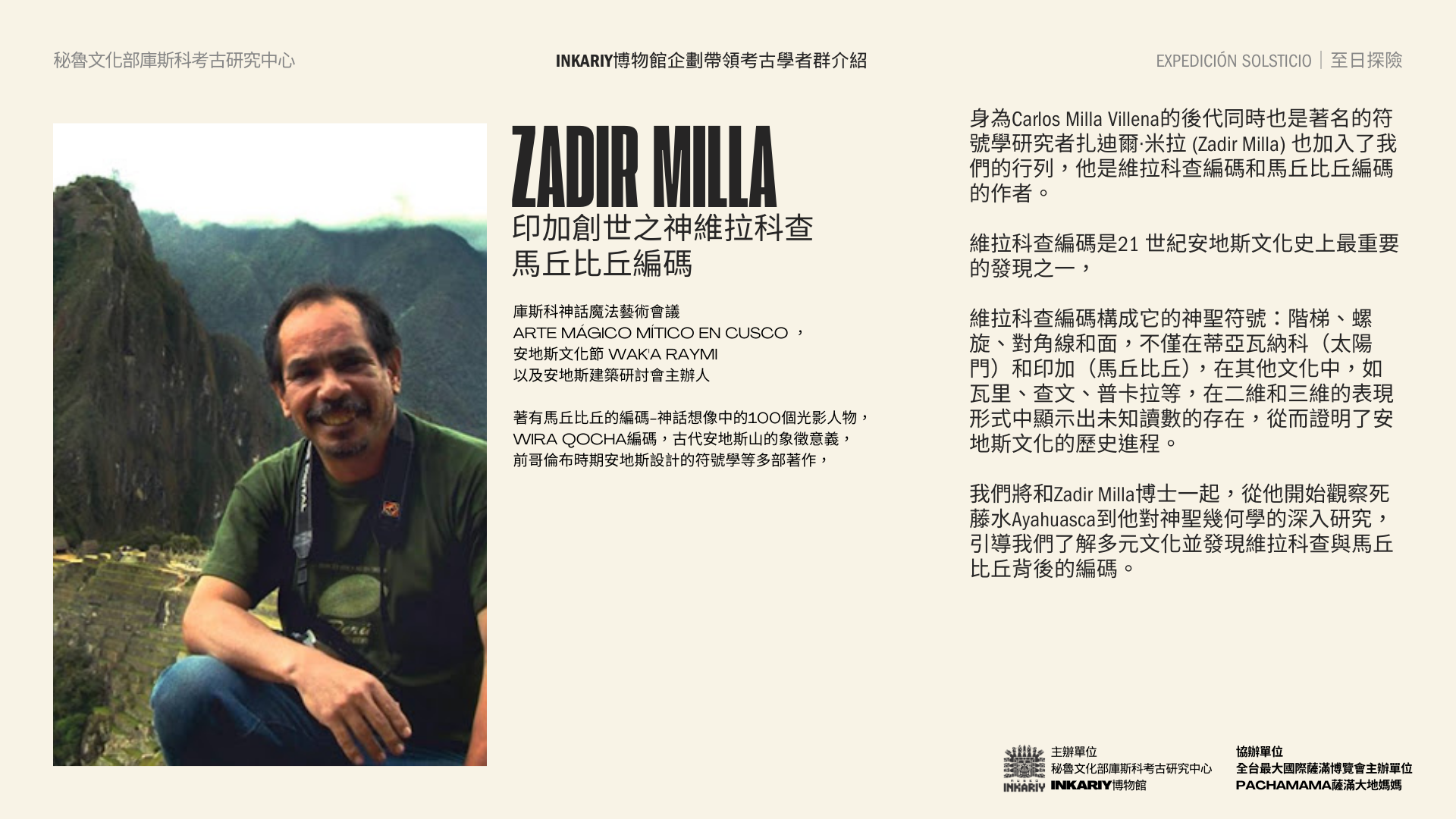 與發現美洲大陸圖坦卡門西潘王的秘魯考古學家之子,歷史上首位將安地斯文明與符號編碼發布問世的考古天文學家,以及墨西哥國家文物探險隊帶領,以情境化路線沈浸式體驗沿著古老的印加創世之神維拉科查Wira Qocha之路,ㄧ同親臨安地斯文明重要的考古遺址,探索安地斯文明的最重要的神話考古遺跡,通往安地斯祖先核心,將我們與推動宇宙的力量和本質