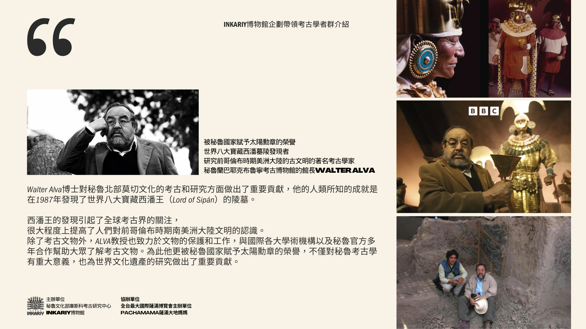 - 考古學巨擘帶:發現「美洲圖坦卡門」西潘王墓陵與最古老的文塔龍祭祀儀式壁畫的考古學家解密