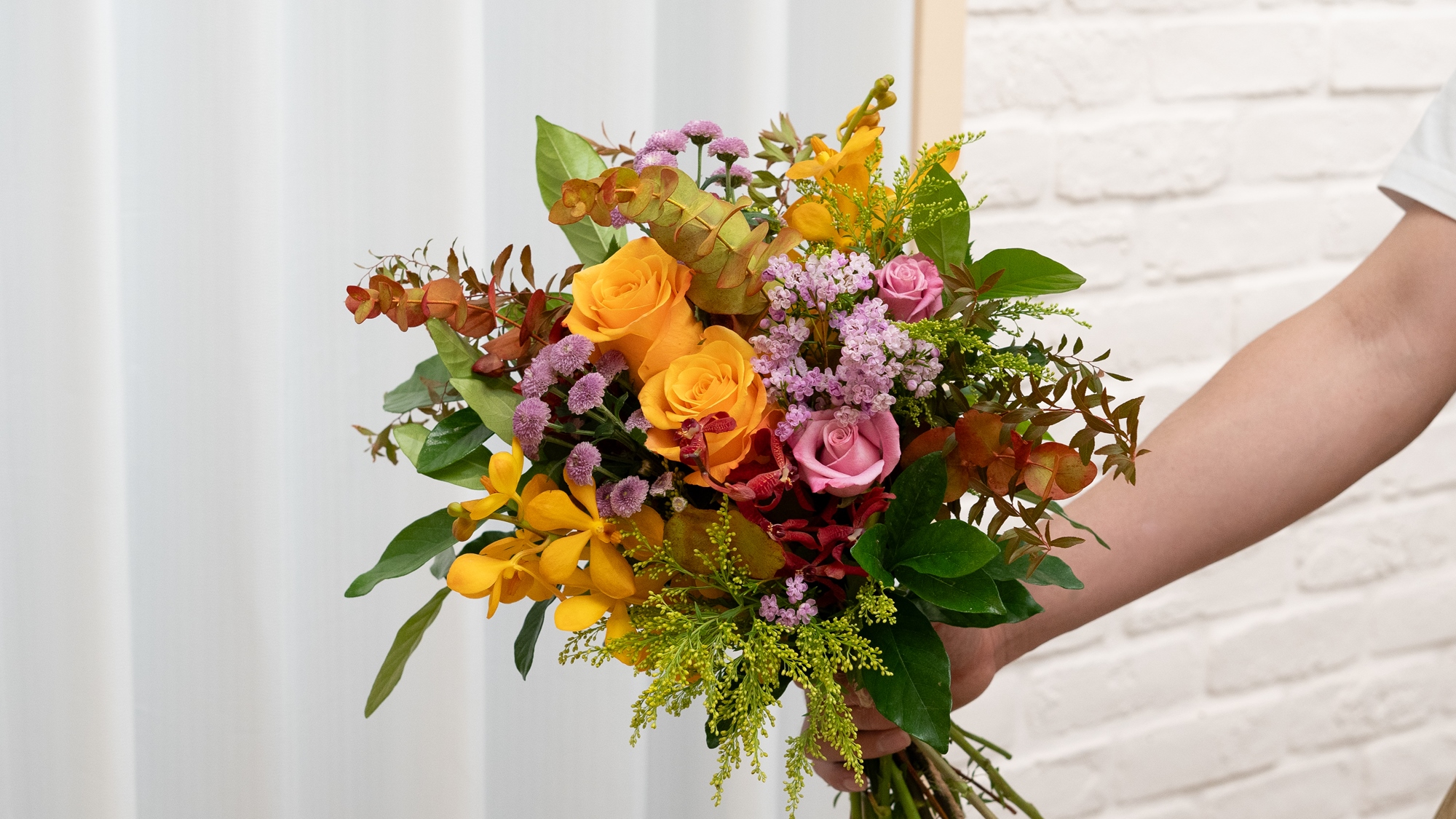 結合季節限定的葉材與鮮花,創作出充滿秋日浪漫的經典圓形手綁花束。