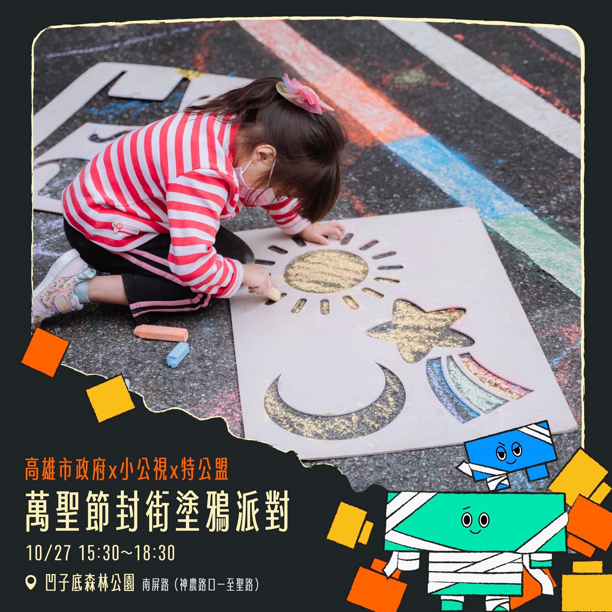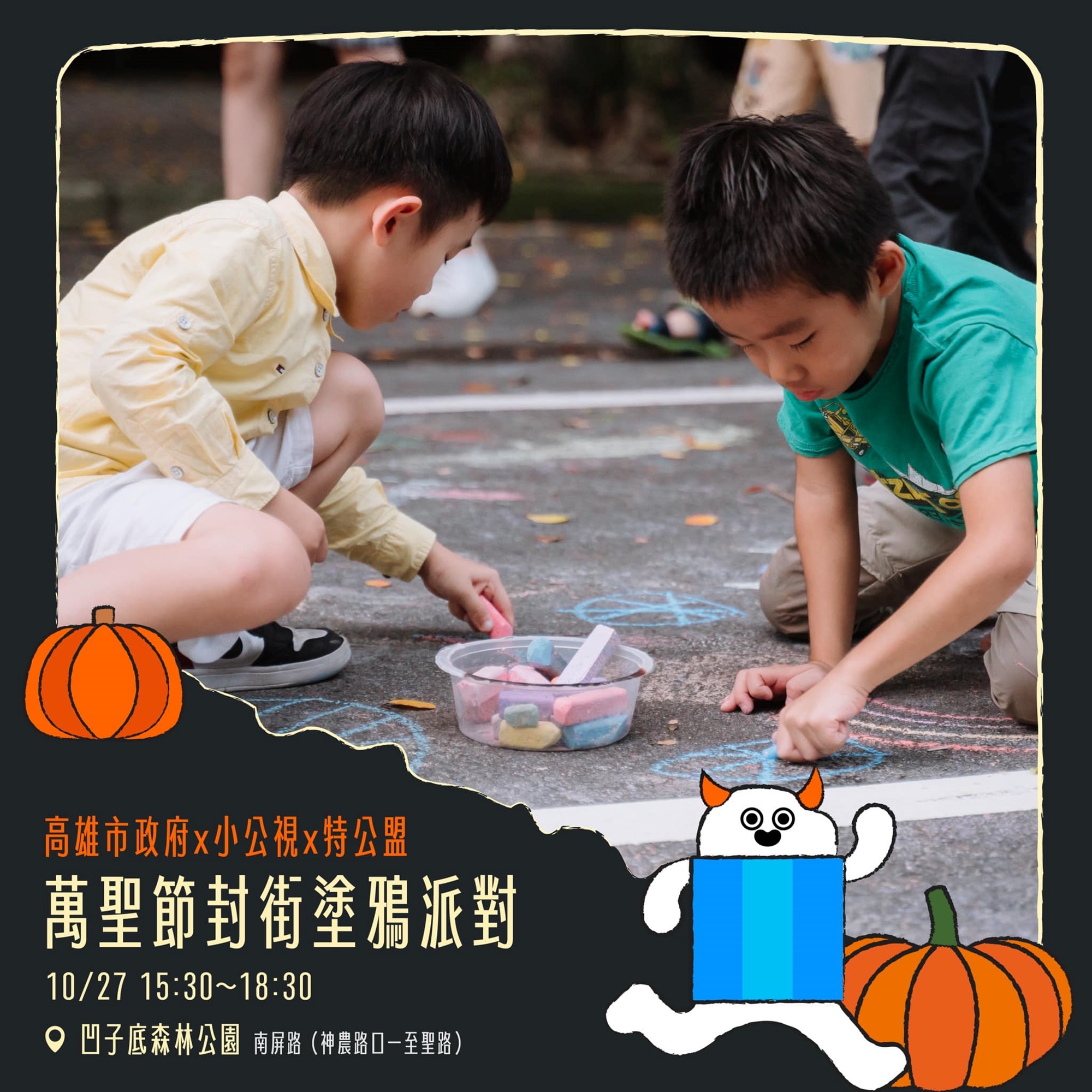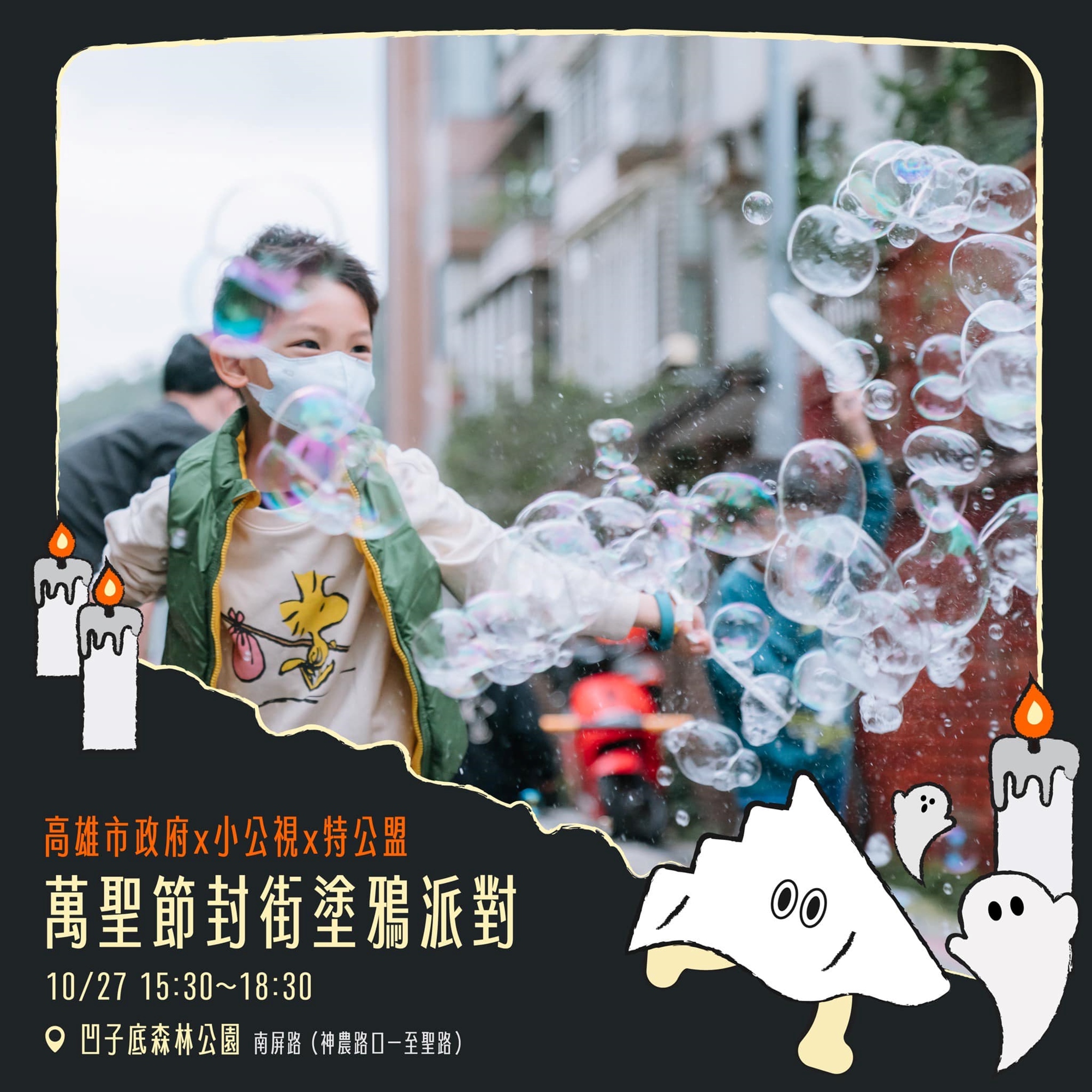 特公盟與高雄市政府、小公視一起萬聖節搗蛋,封街高雄市南屏路變成巨型彩繪場,號召全家大小來彩繪街道、玩巨型泡泡!🫧