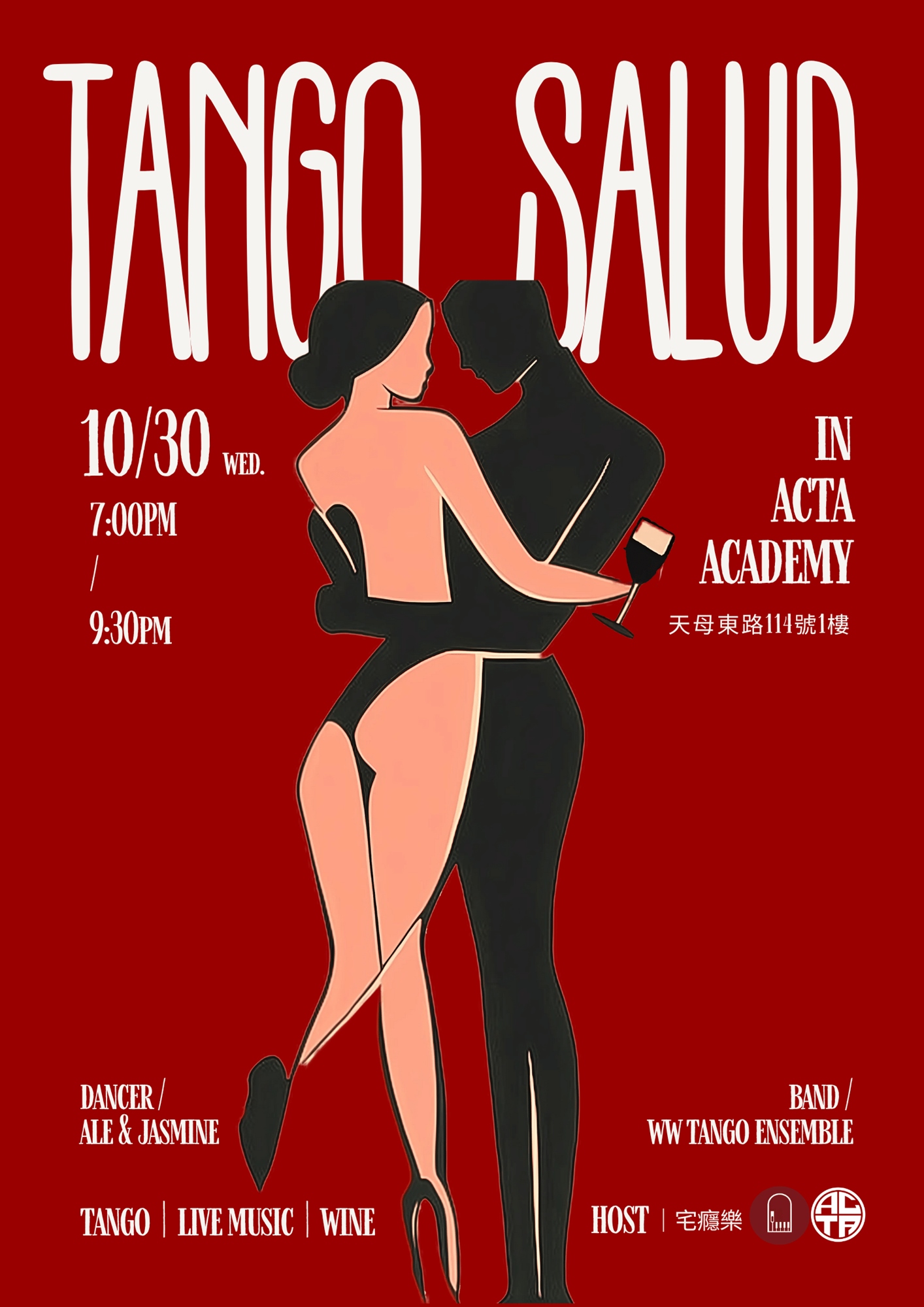 一堂基礎小白探戈體驗課,歡迎完全未曾接觸過阿根廷探戈舞蹈的你,一場現場樂團演出,搭配一杯精心挑選的紅酒,歡迎你來,擁抱、走路、交換彼此心跳的聲音,然後一起喝醉。