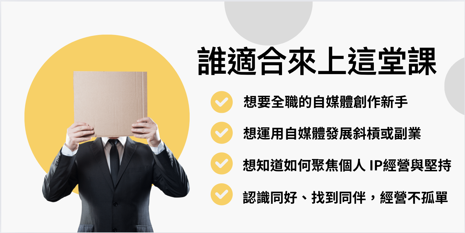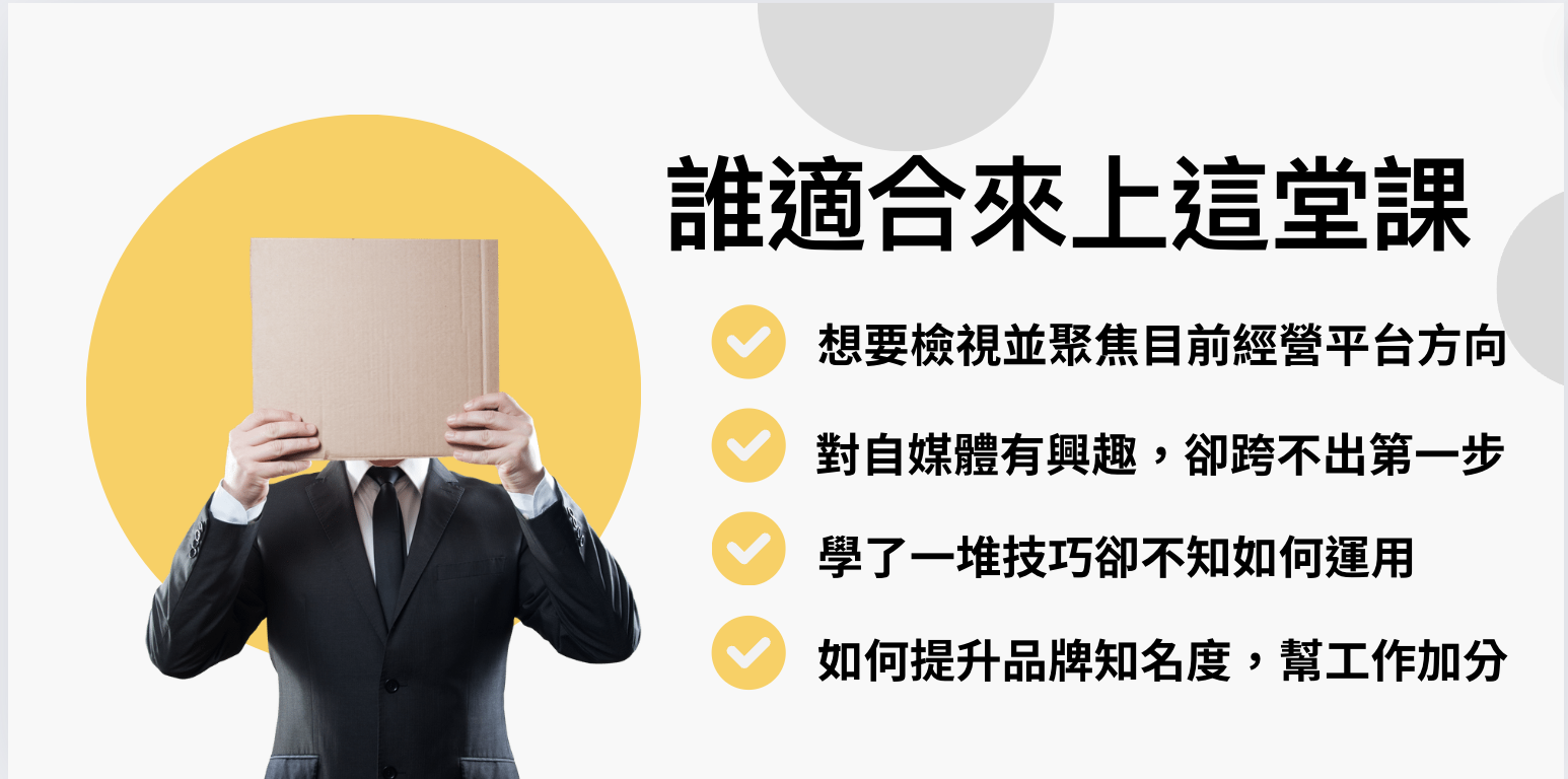 切中自媒體新手如何往上爬的心路歷程與要害,讓你少走很多冤枉路,還能在活動中與參加者彼此交流獲得實戰建議。