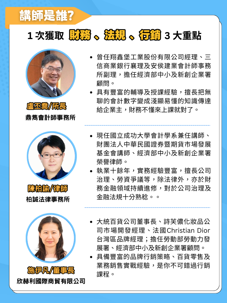 其他場次請至 創業後協助及輔導課程專區 瞭解資訊