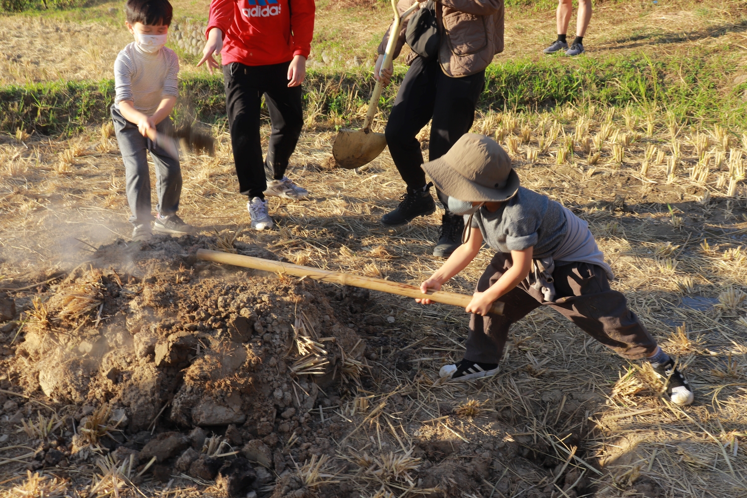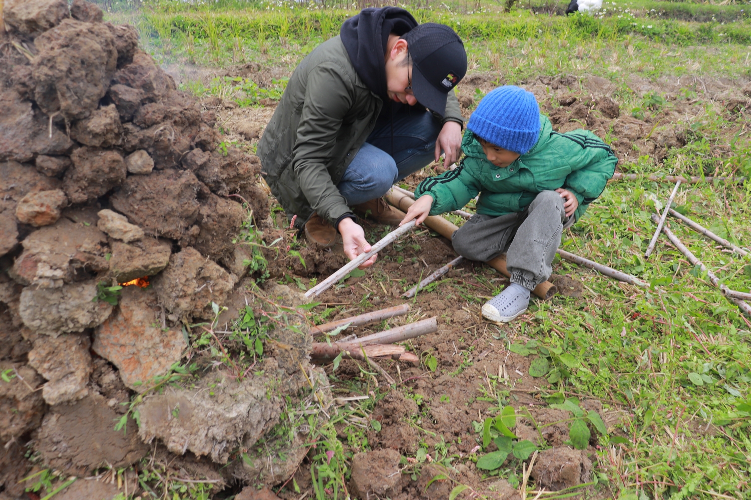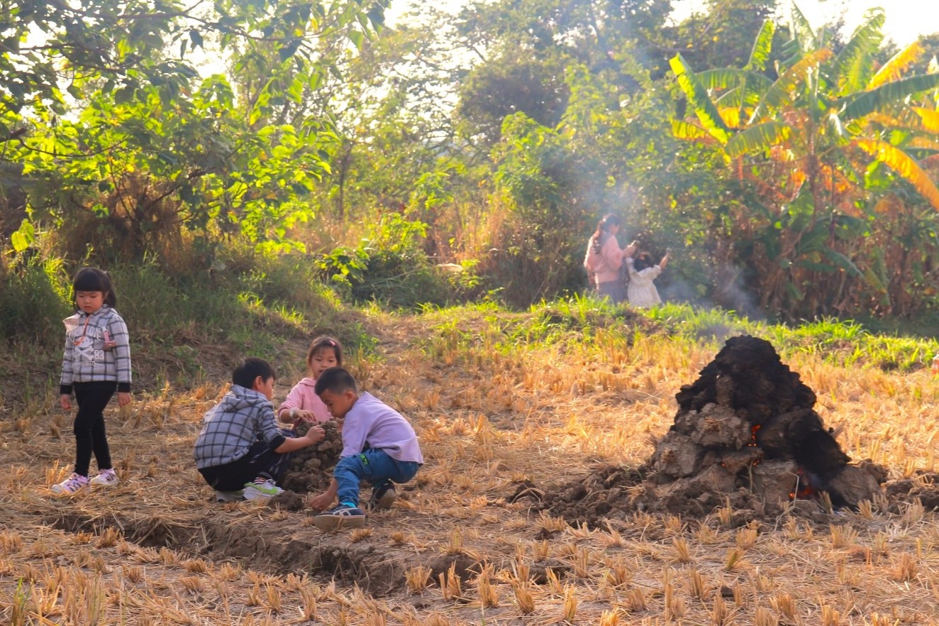 收割完的稻田,就是每年焢窯的好時節!焢窯的關鍵是什麼呢? 是怎樣把土塊燒紅?還是怎樣把裝了食材的鐵罐放進燒紅的土窯中?或者,怎樣把食材取出來才不會傷到好吃的番薯、玉米?