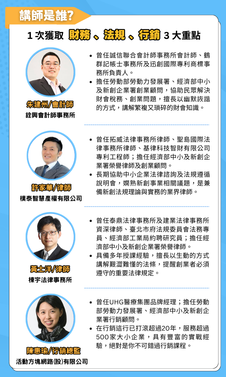 其他場次請至 創業後協助及輔導課程專區 瞭解資訊
