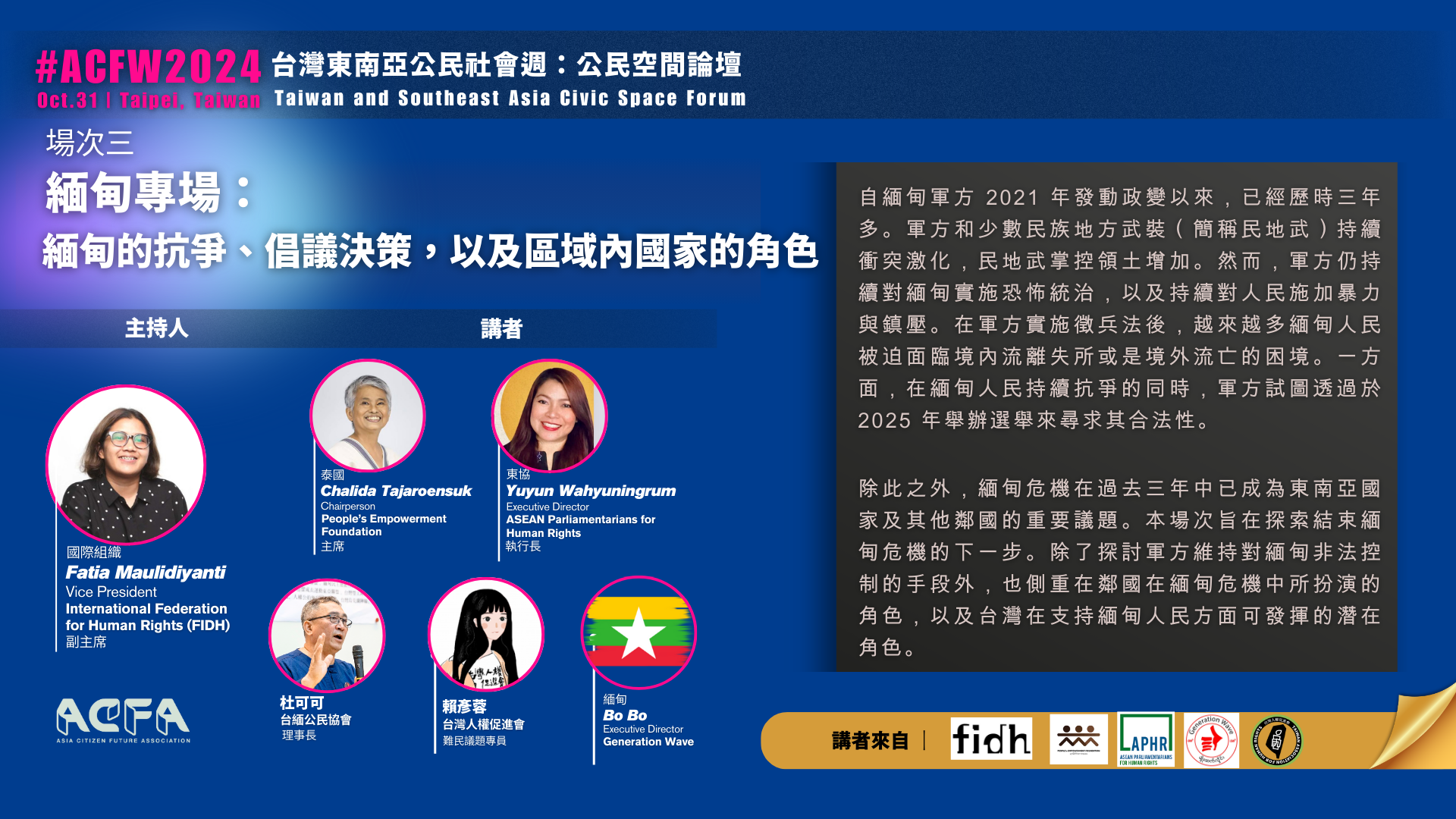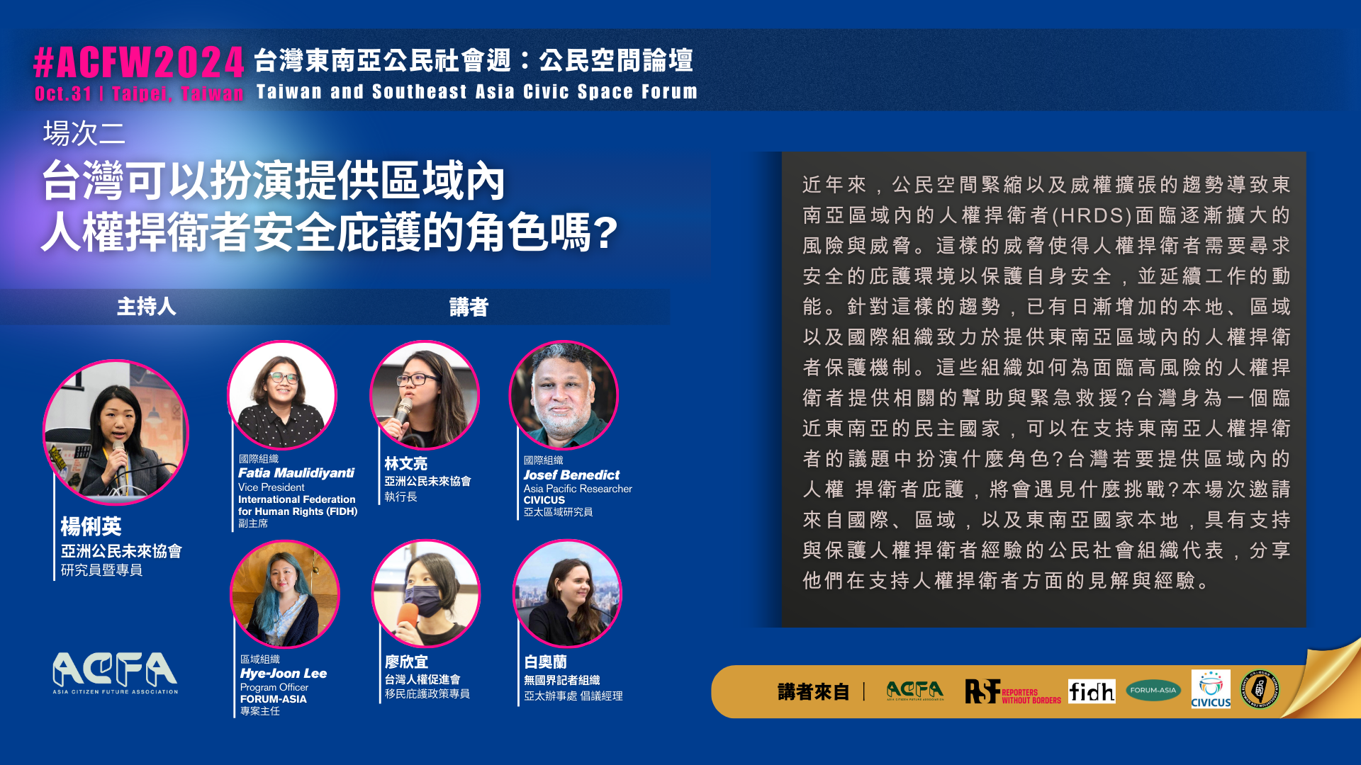 亞洲公民未來協會執行長將於開場致詞中分享台灣提供區域內人權捍衛者保護、及提供區域內公民社會組織安全的公民空間以延續工作的潛在角色。