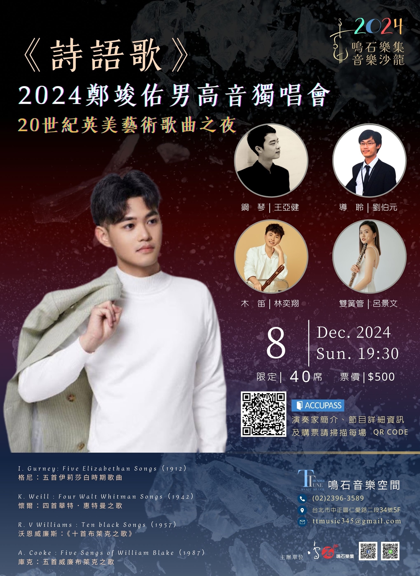 2024年男高音鄭竣佑今年再度到鳴石樂集演出,今將再度和鋼琴家王亞健攜手合作,並邀請音樂學博士劉伯元、溫柔美麗的雙簧管演奏家呂景文以及宜蘭傑出青年-木管魔法師林奕翔演繹新穎的英美經典。